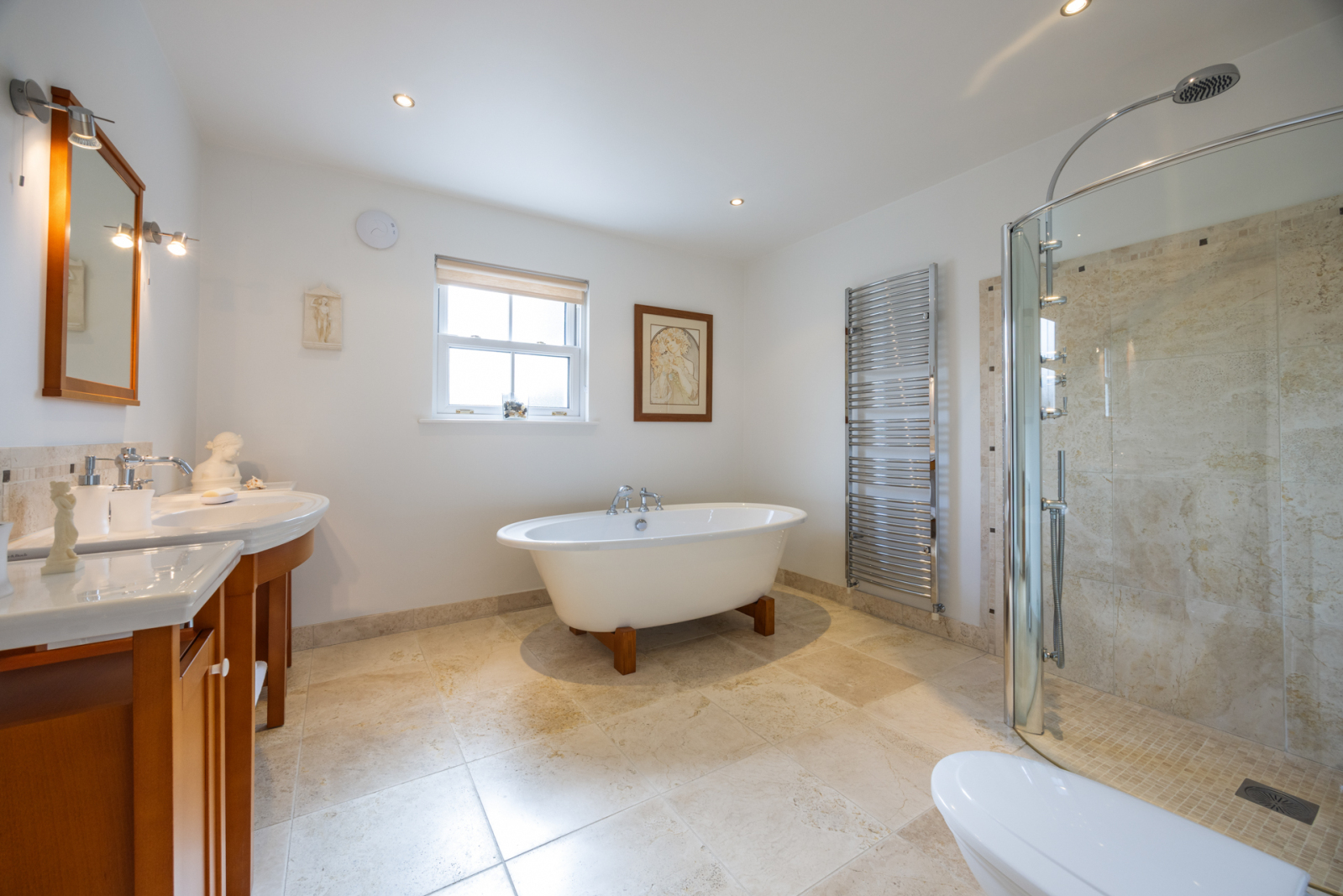 White suite comprising: Adamsez Oval bath with mixer taps and shower fitting, walk in shower cubicle, overhead rain shower, Villeroy and Boch suite comprising, low flush WC, vanity sink unit, ceramic tiled floor, chrome towel radiator.