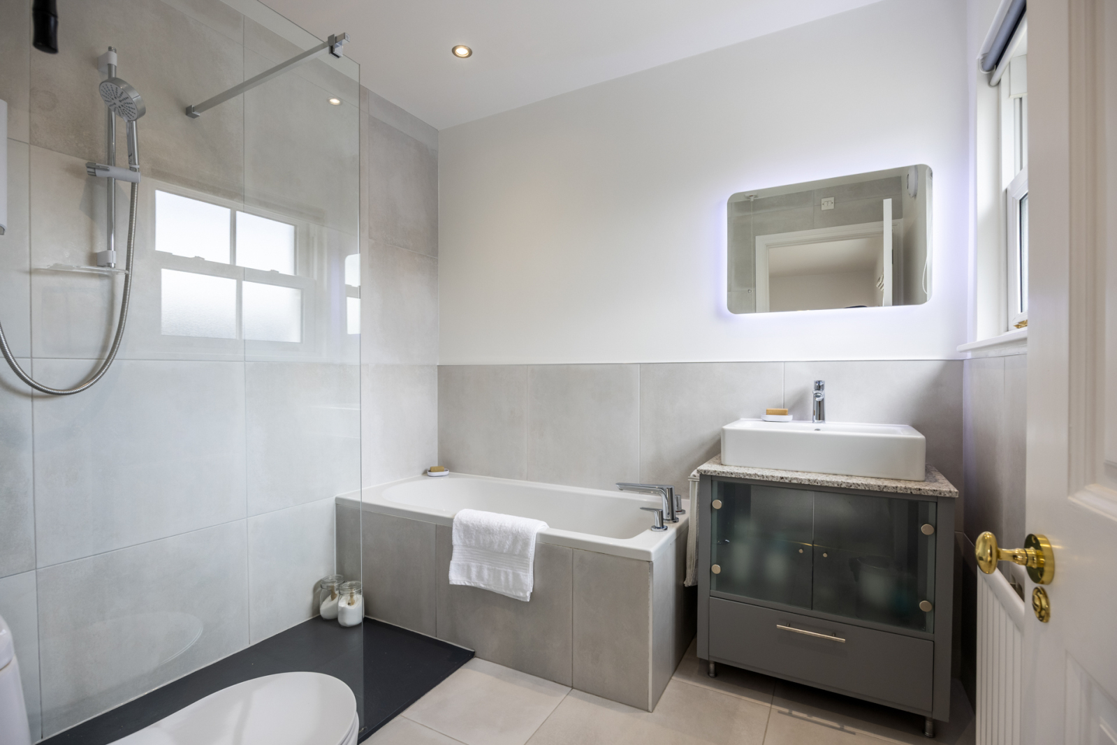 Fully tiled shower cubicle, instant heat electric shower, panelled bath with mixer taps, vanity sink unit with mixer taps, low flush WC, half tiled walls, ceramic tiled floor.