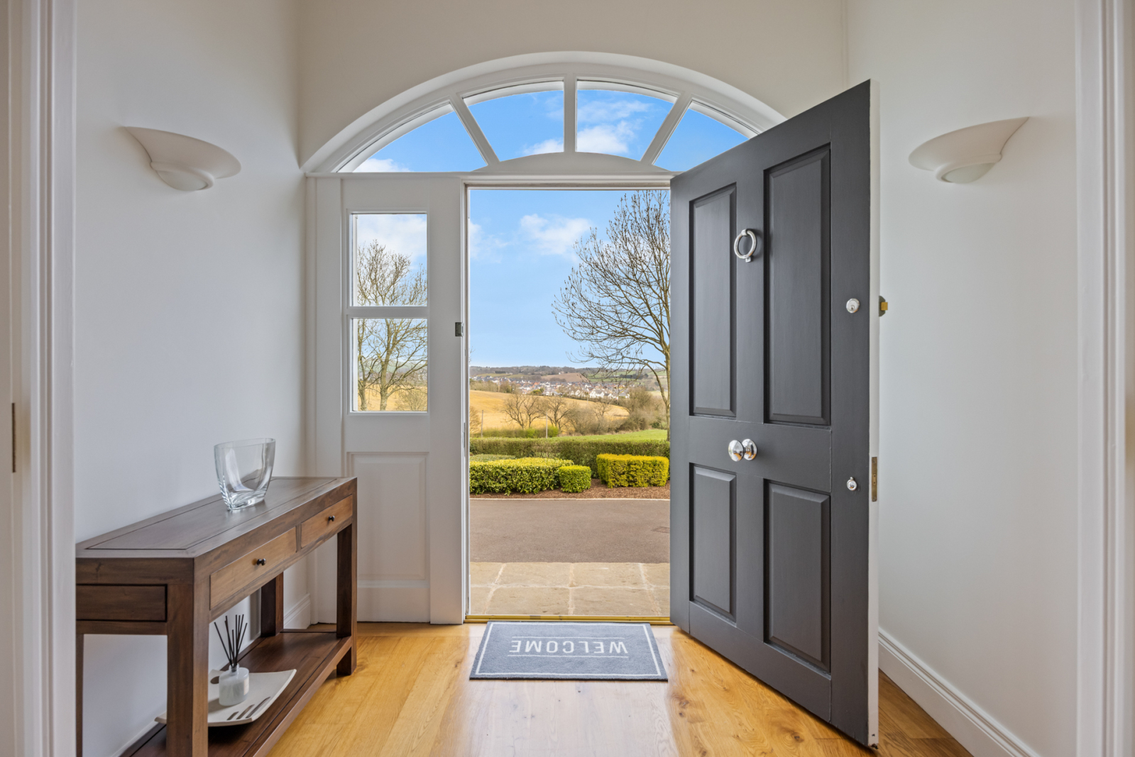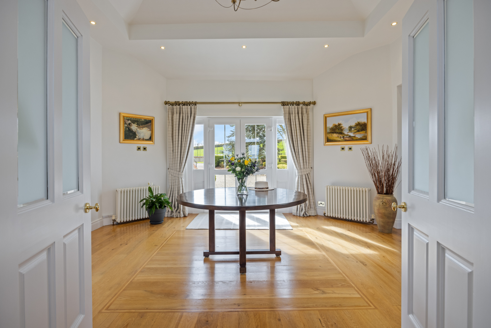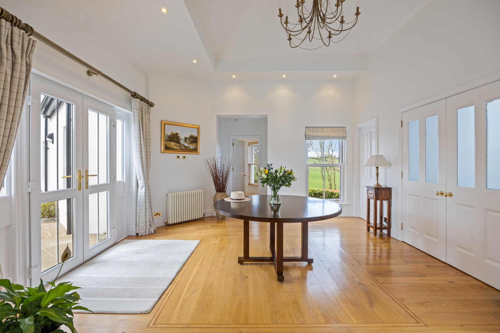Mahogany front door with double glazed side panels with arch fan light, views to Scrabo and countryside, solid oak floor and double doors to: