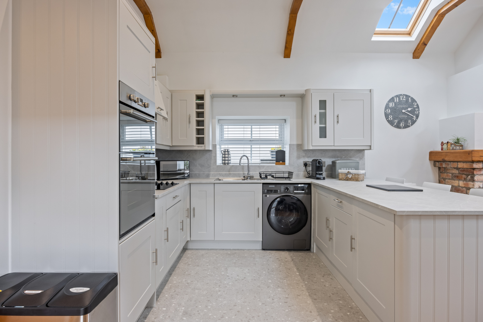 Full range of high and low level units, integrated fridge, dishwasher and freezer, 4 ring ceramic hob, extractor hood over, eye level oven and grill oven, plumbed for washing machine, stainless steel single drainer sink unit with mixer taps, breakfast bar.