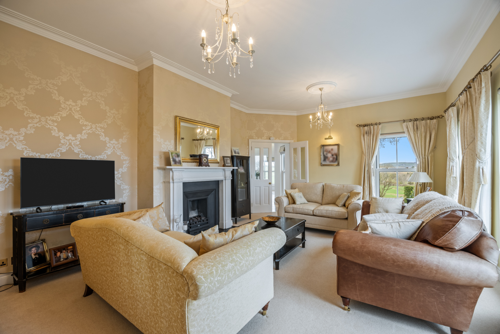 Dual aspect with views to Scrabo Tower. Marble fireplace with cast iron inset, open gas fire and slate hearth, corniced ceiling,