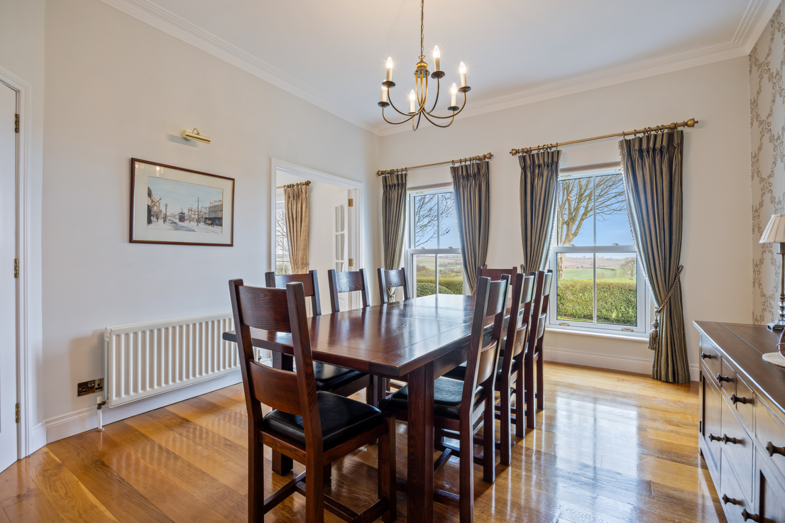 Accessed via impressive stone pillars and remote-controlled gates, a sweeping driveway leads through beautifully manicured gardens to the main residence, constructed in 2002 and extending to circa 4,000 sq ft of bright, well-proportioned accommodation. The property has been thoughtfully designed for both modern family living and entertaining, with a striking double-height reception hallway, an elegant drawing room with open gas fire, and a superb Lonsdale kitchen with a full range of integrated appliances, open to a casual dining area. A breakfast room and sun room, complete with vaulted ceiling and multi-fuel stove, both enjoy stunning views over the grounds and open onto a variety of patio areas ideal for outdoor entertaining. Additional accommodation includes a family room, formal dining room and separate utility room.
