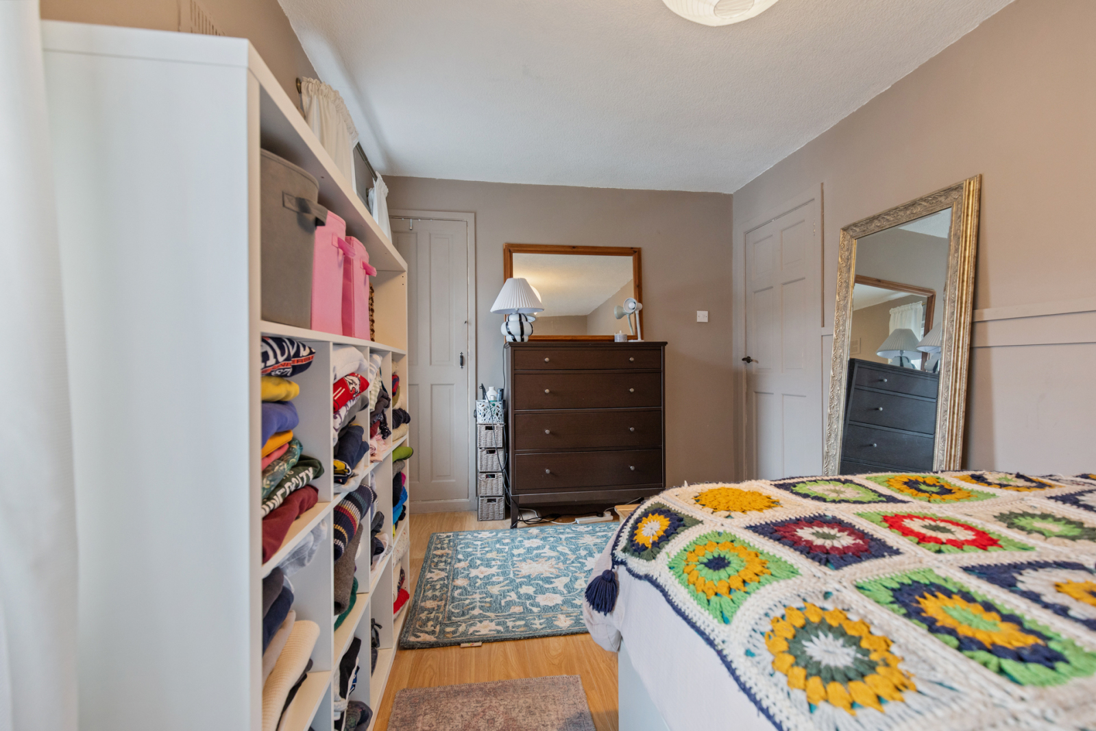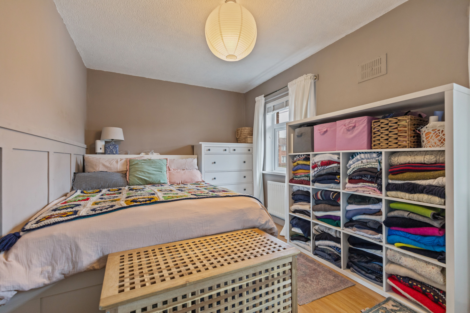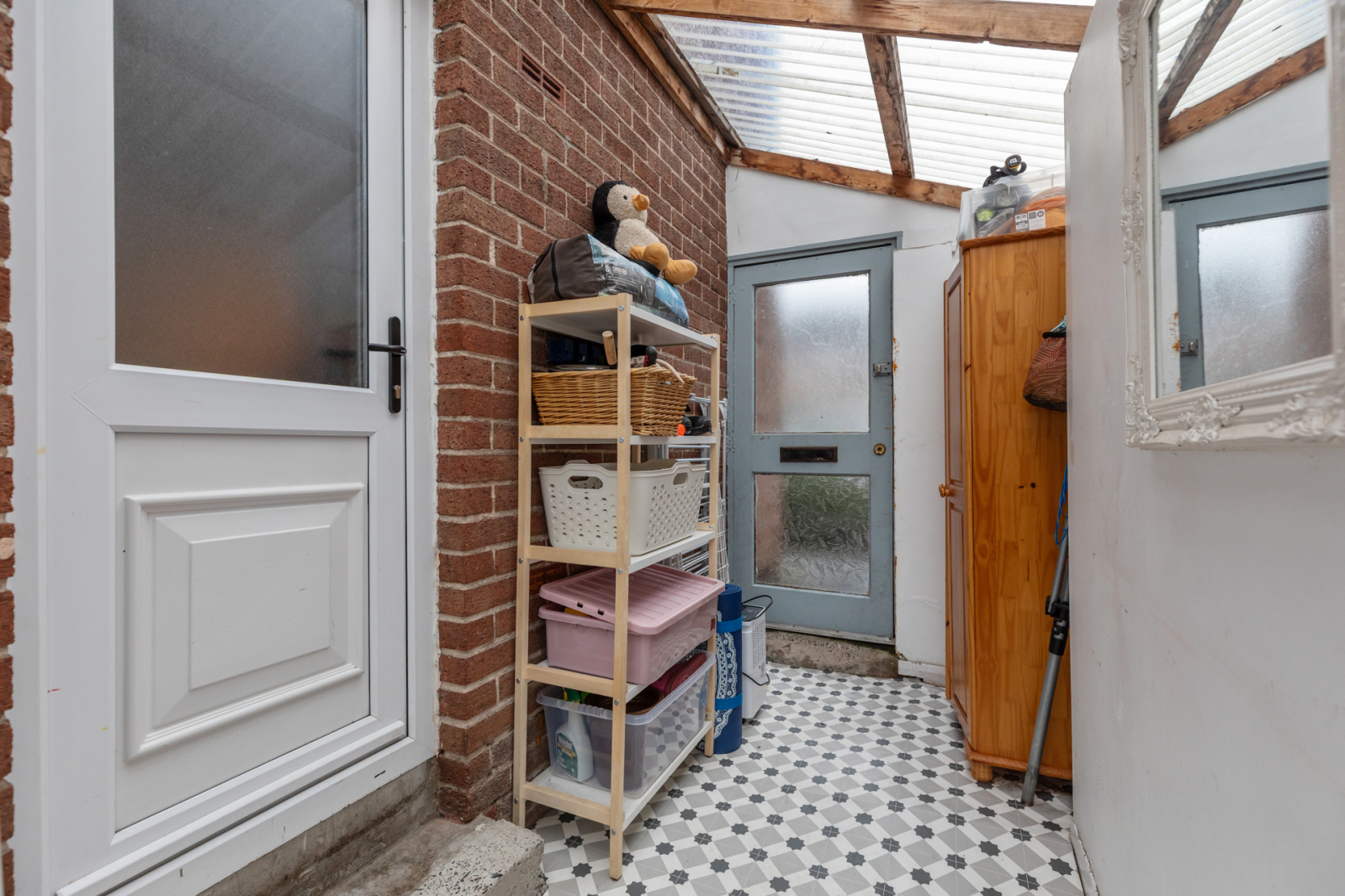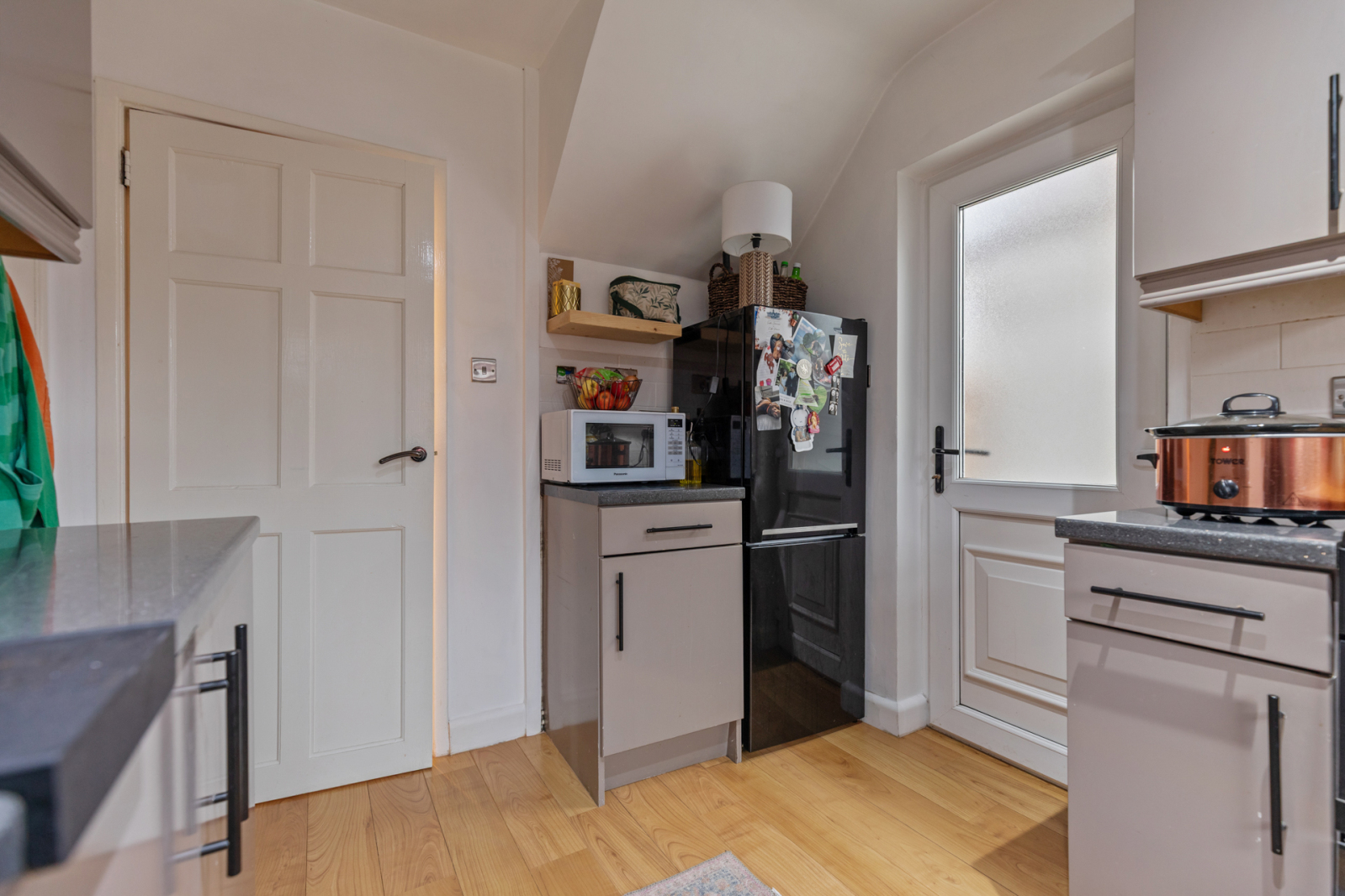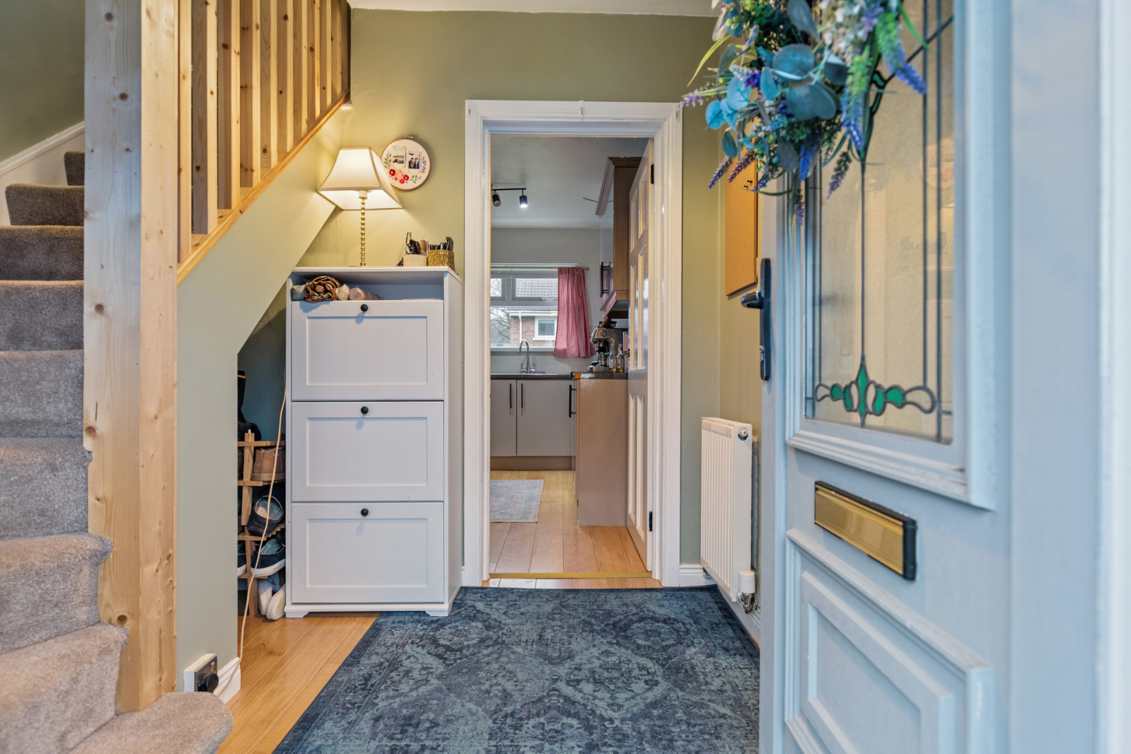 Laminate wood effect flooring, outlook to front, storage cupboard.