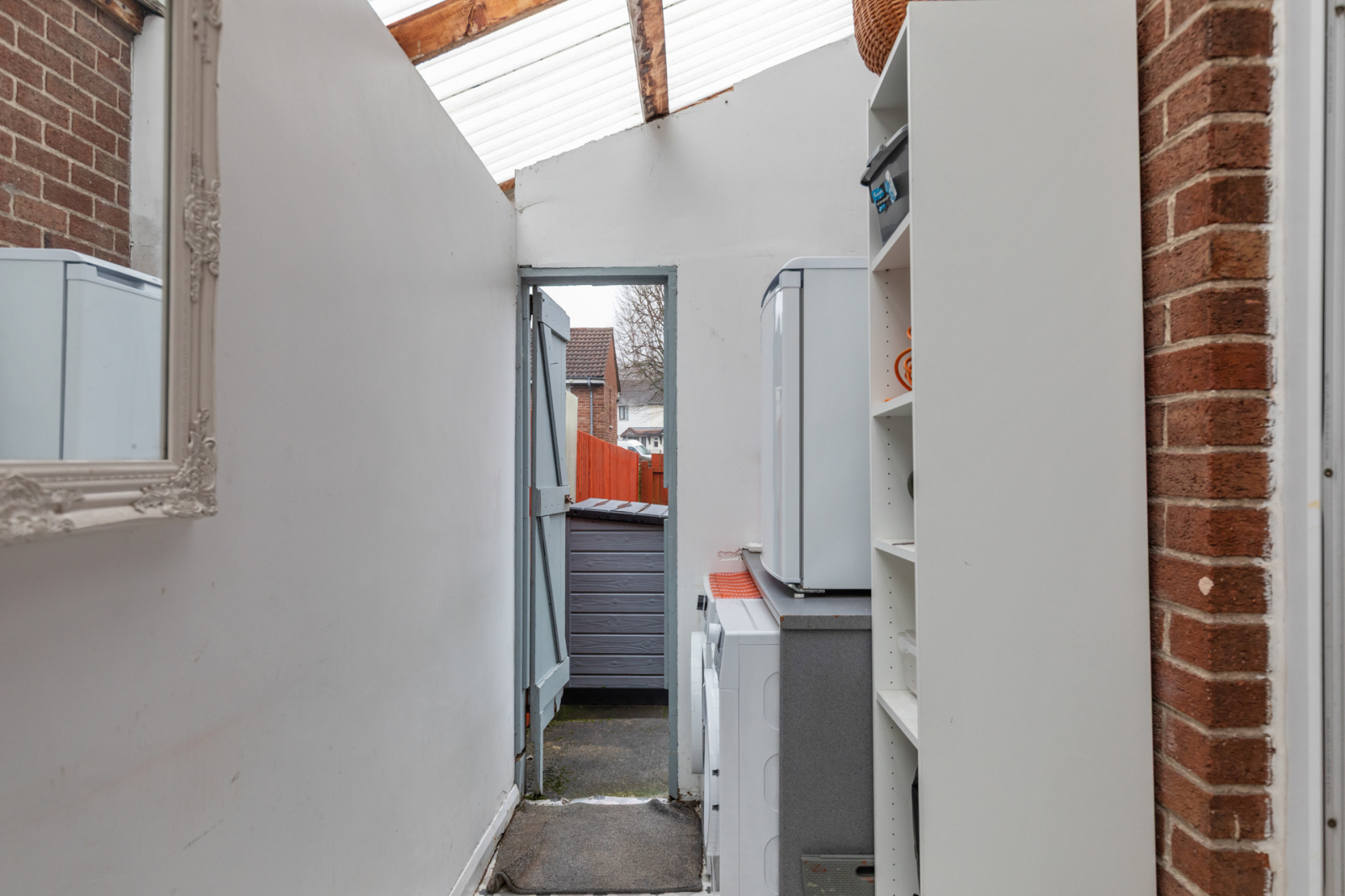 Space for tumble dryer, plumbed for washing machine, vinyl flooring, access to front and rear.