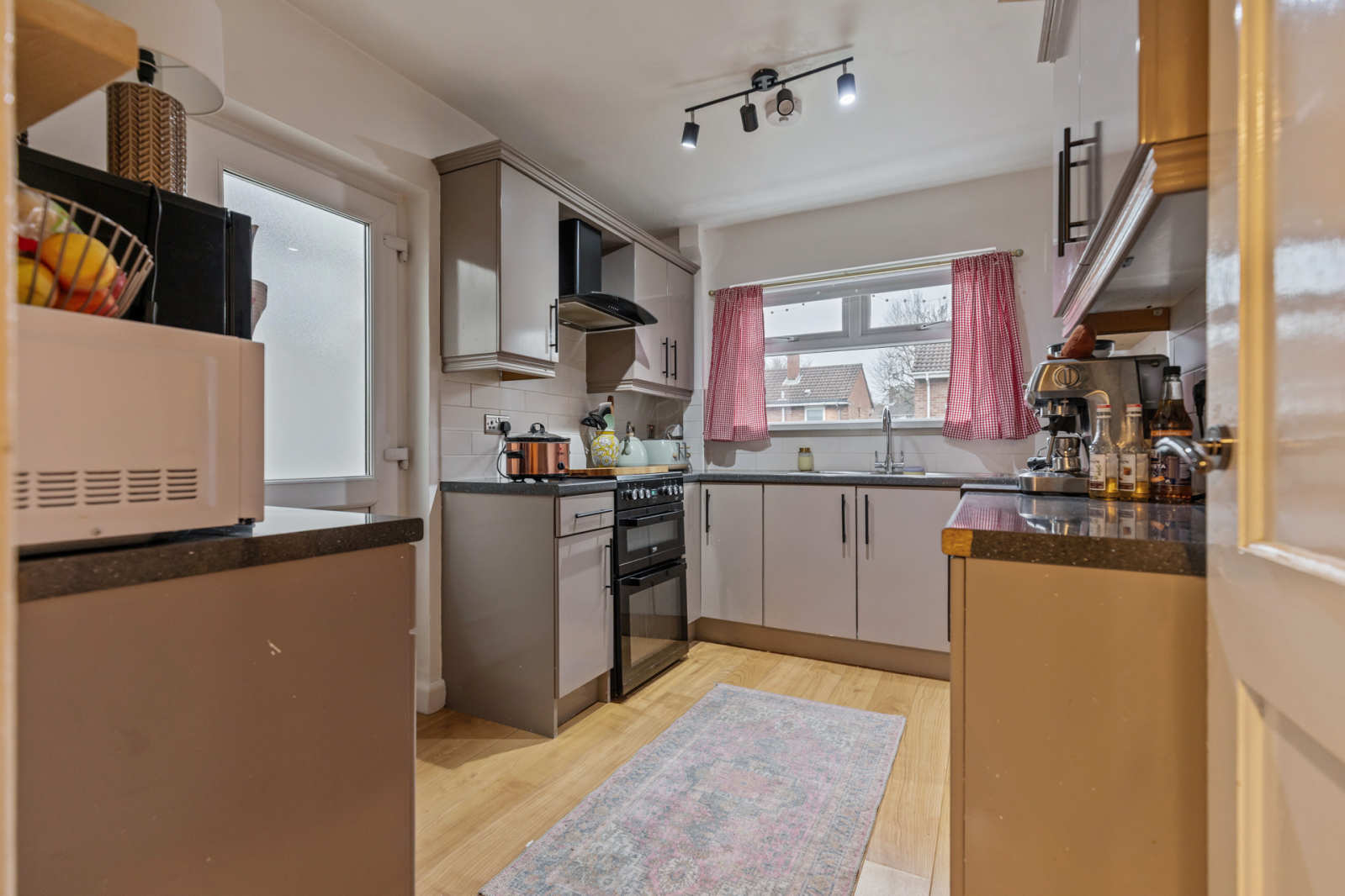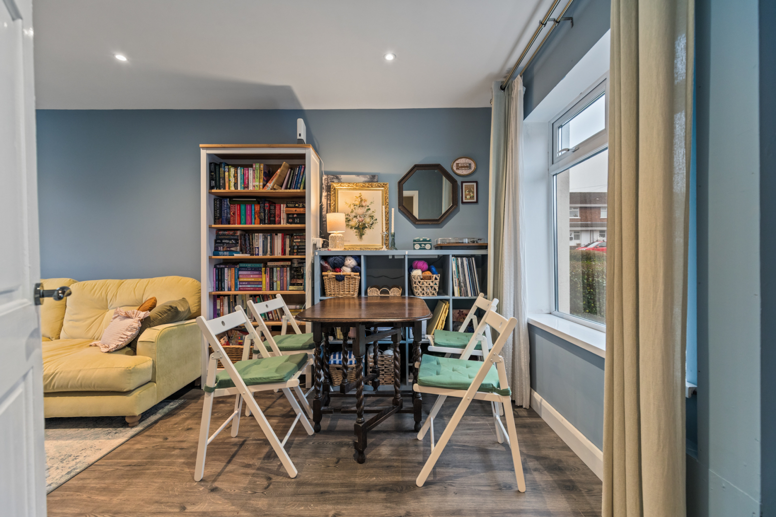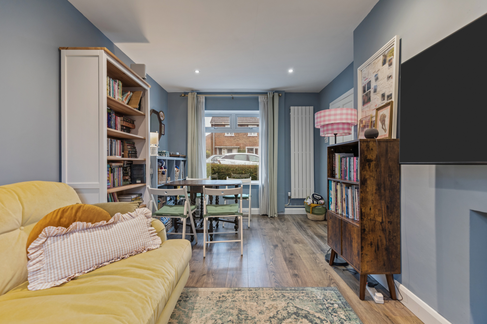 Dual aspect to front and side, recessed spotlighting, laminate wood effect flooring.