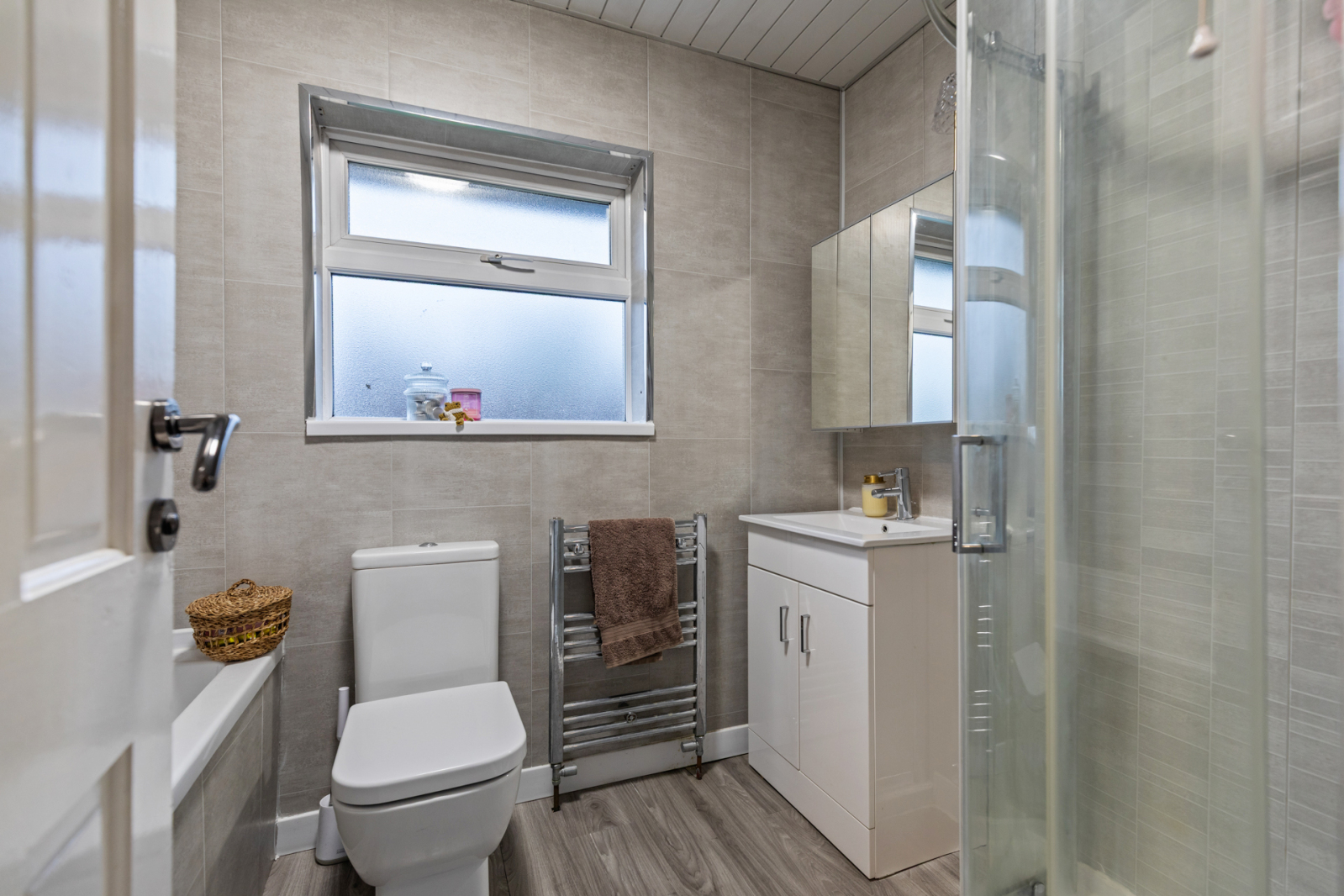 White suite comprising of low flush WC, vanity unit with mixer tap and wash hand basin, panelled bath with hot and cold tap, walk-in thermostatically controlled shower with rainfall shower head and handset. Panelled walls, laminated woof effect flooring, vertical chrome heated towel rail.