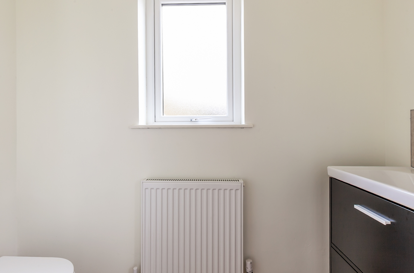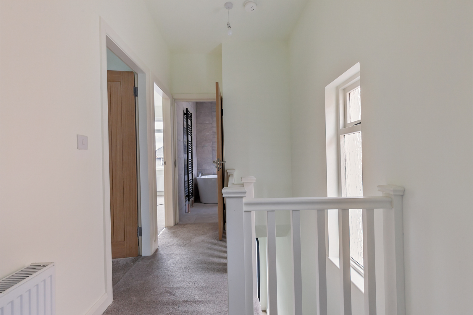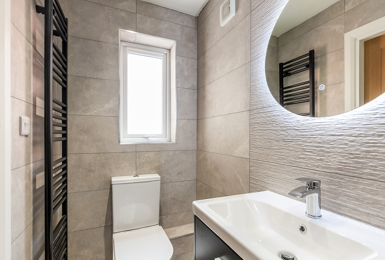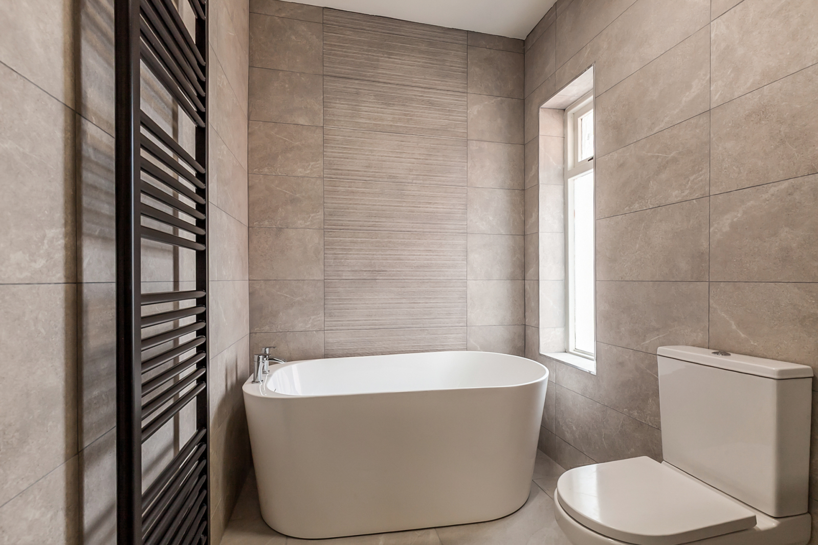 White suite comprising: Oval bath, vanity sink unit, low flush WC. fully tiled walls, ceramic tiled floor, towel radiator.