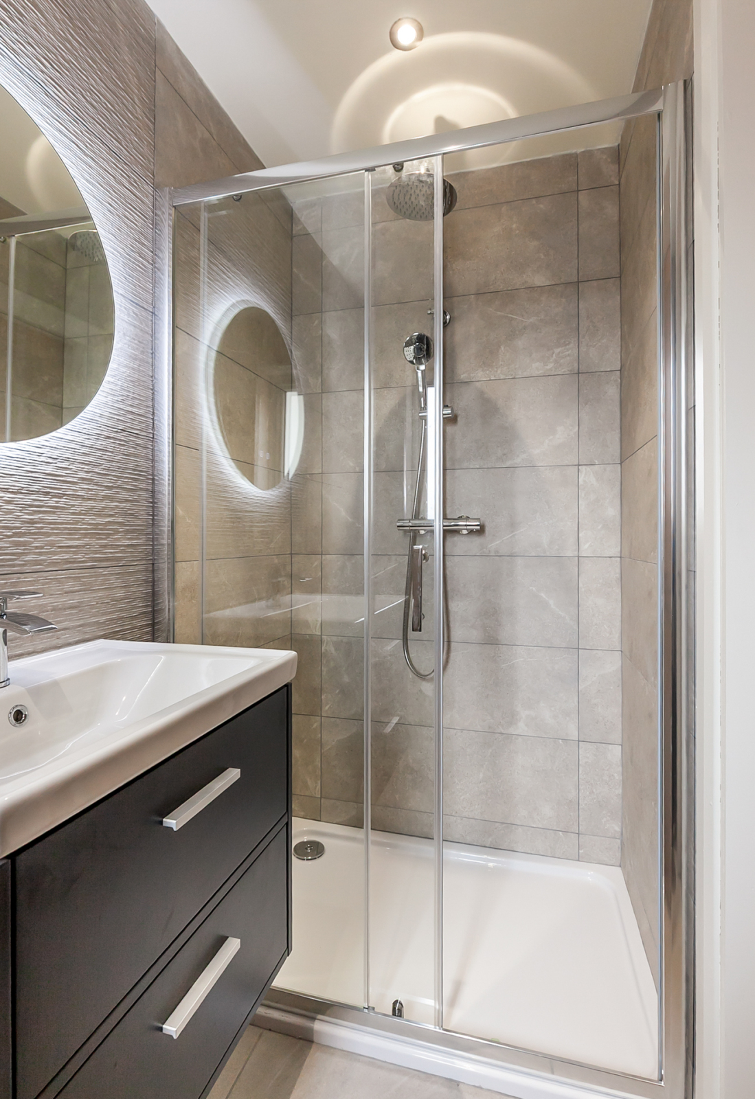 Fully tiled shower cubicle with overhead rain shower, vanity sink unit, low flush wC, fully tiled walls, ceramic tiled floor, towel radiator.