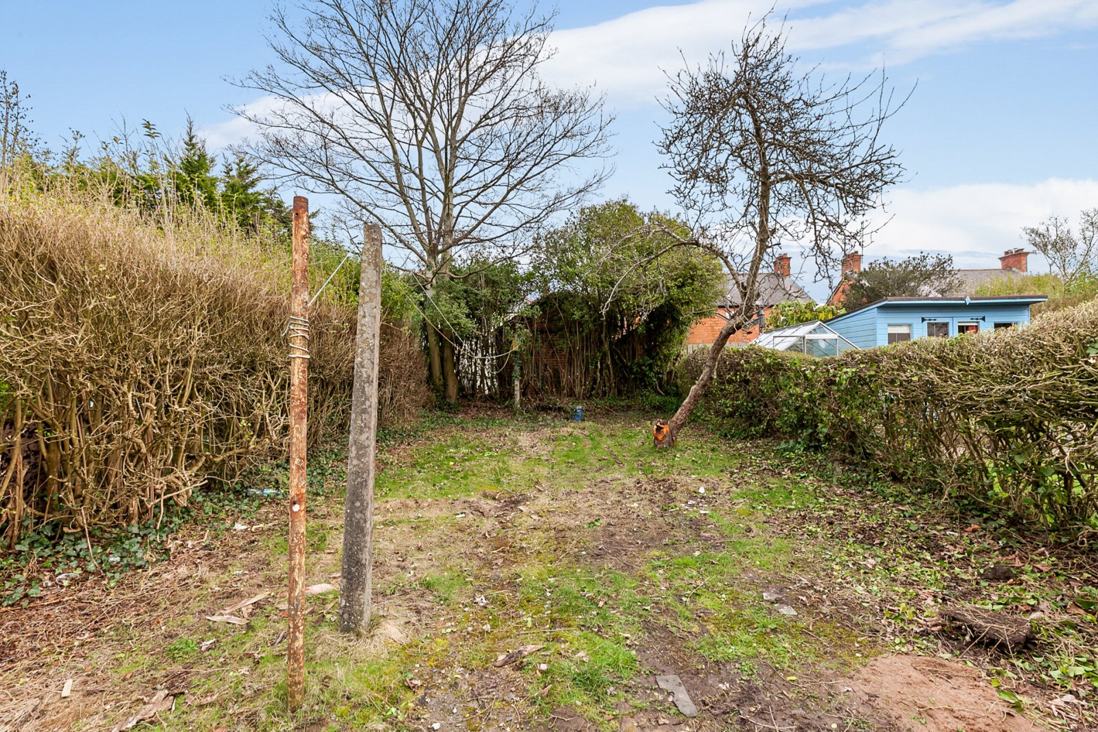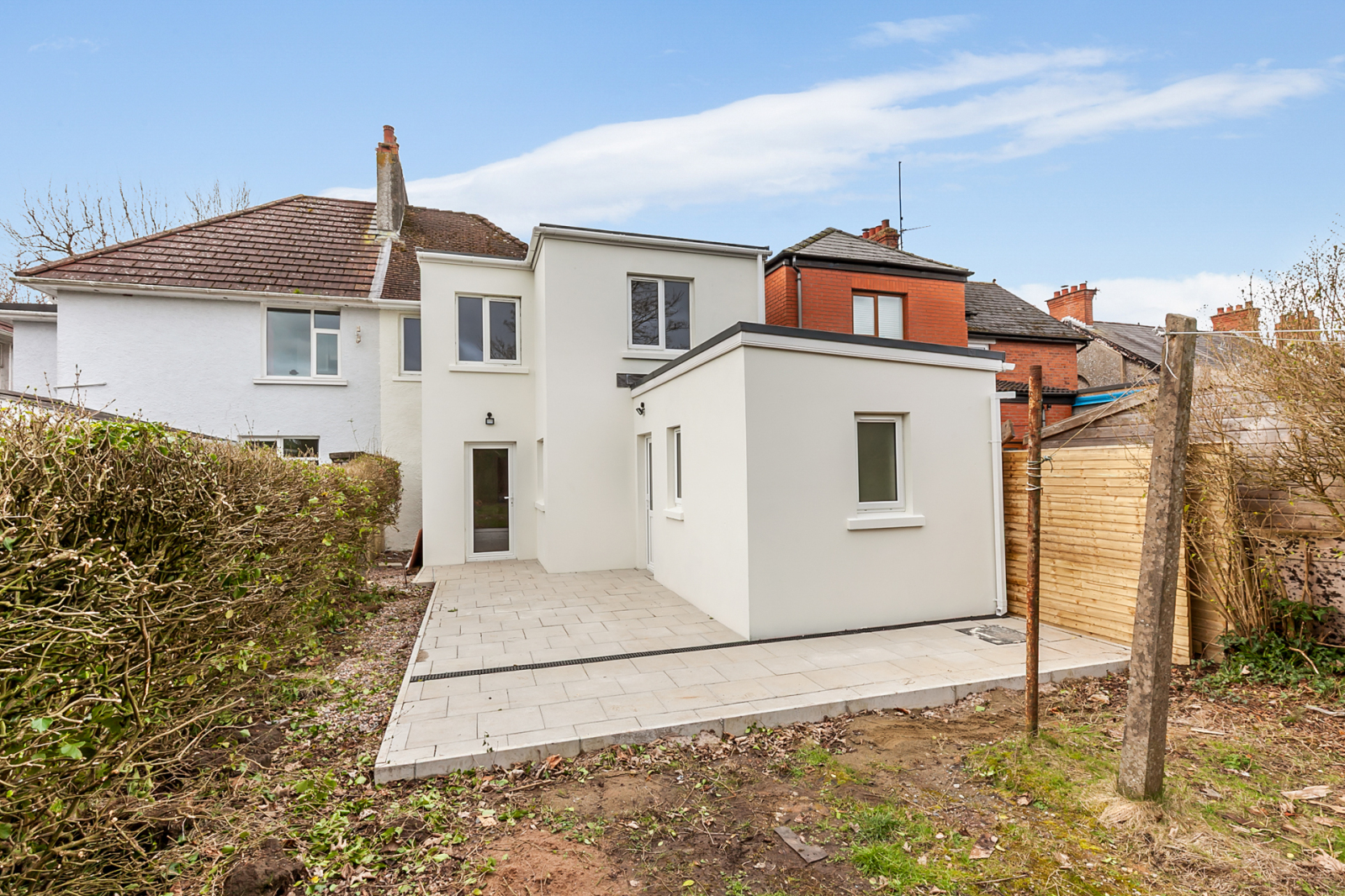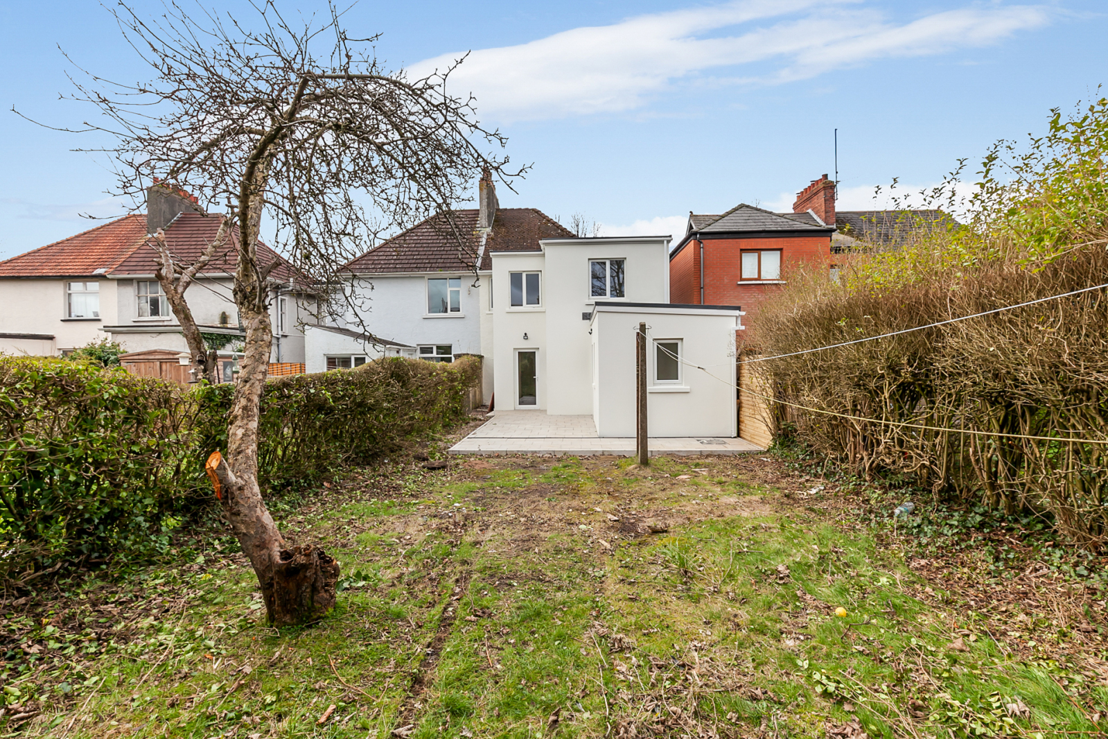 To the rear, a paved patio area leads to a large enclosed garden, creating the perfect outdoor space for family enjoyment and summer gatherings.