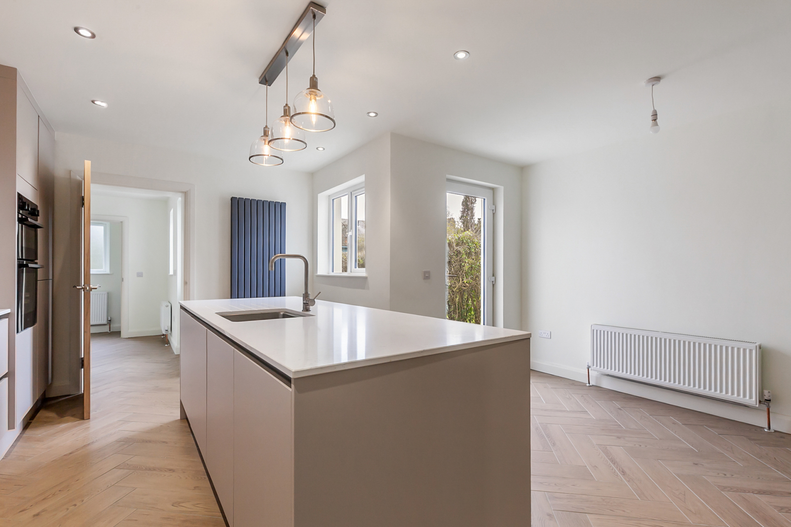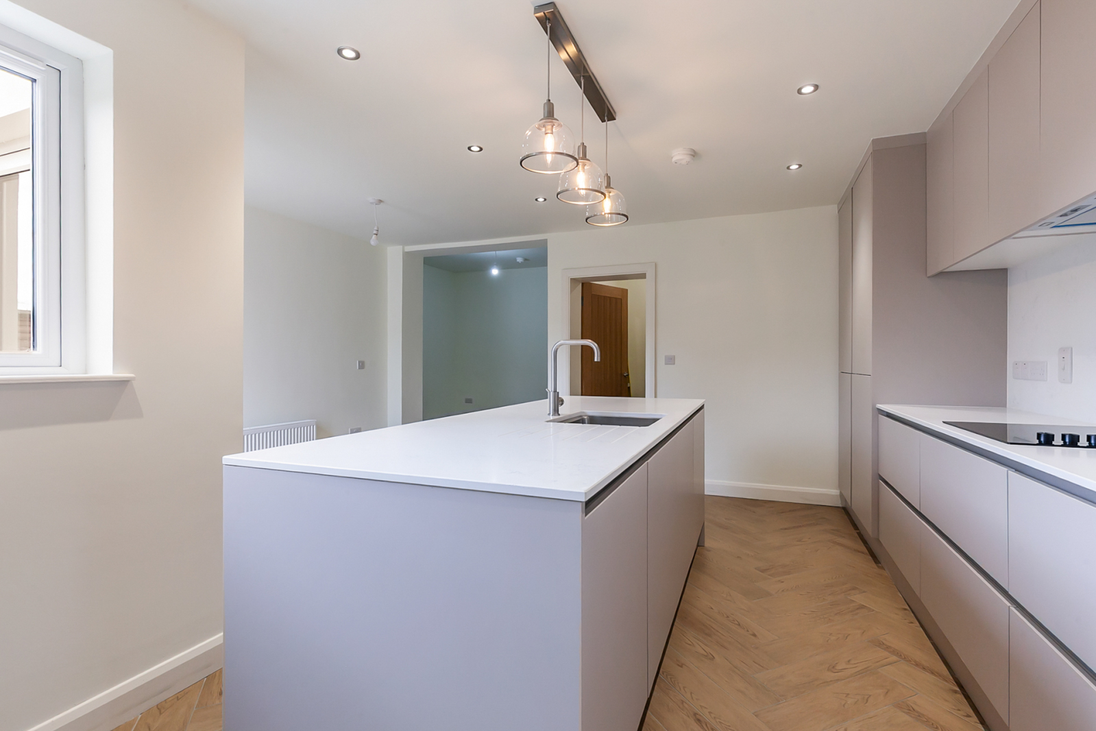 Full range of high and low level units with Quartz work surfaces and splashback, full length fridge freezer, dishwasher, eye level oven, 4 ring ceramic hob with extractor canopy over, central island breakfast bar with Quartz work surfaces, stainless steel single drainer sink unit with mixer taps, ceramic tiled floor.