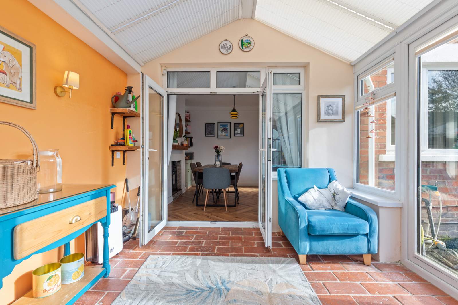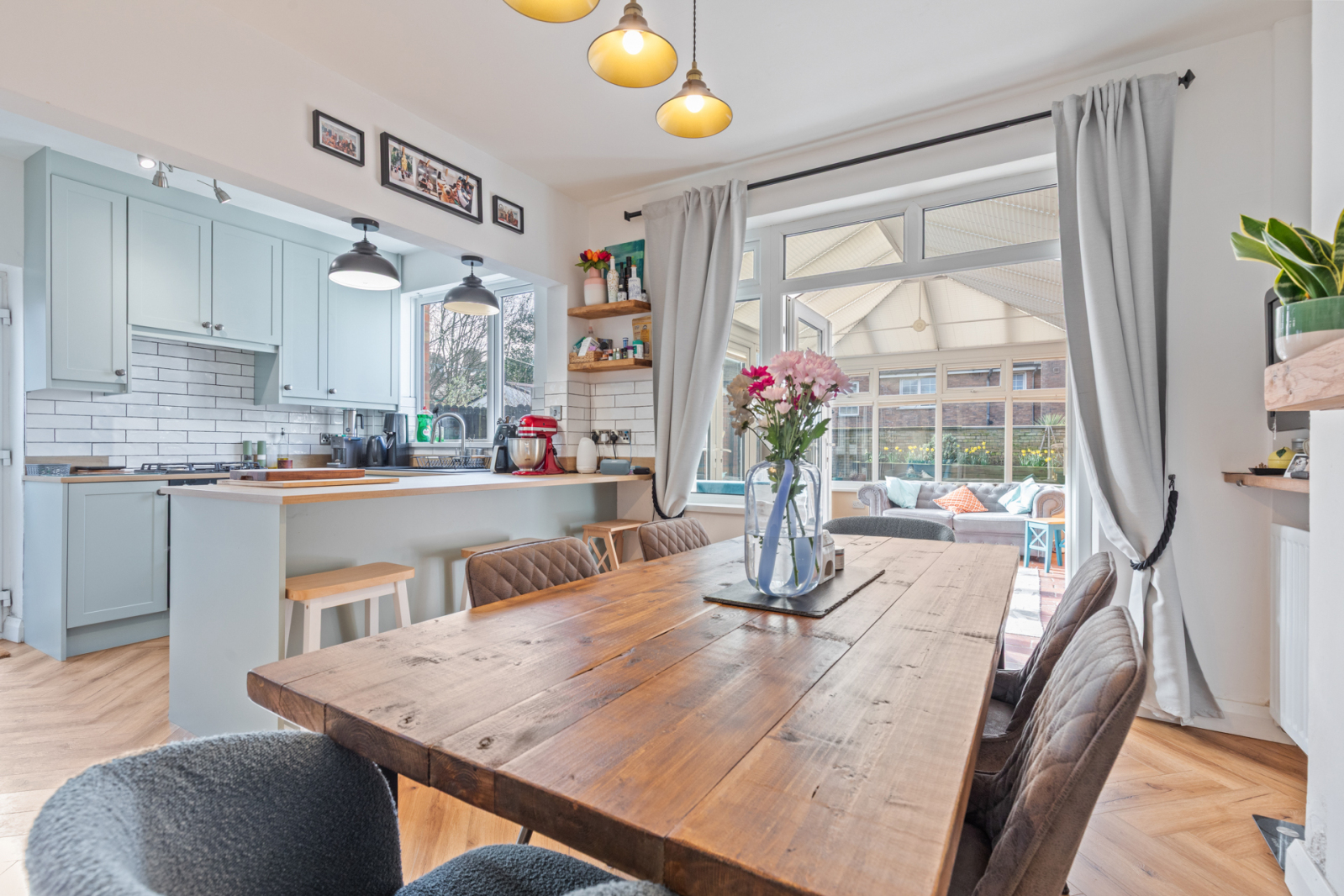 The well-appointed layout comprises a welcoming entrance hall with a convenient cloaks area below the stairs. The bright and spacious living room features a charming cast iron gas stove, a separate open plan recently fitted modern kitchen, boasting a fantastic range of integrated appliances, offering both style and functionality, onto dining room-ideal for entertaining, From here a large conservatory overlooks the generous garden.