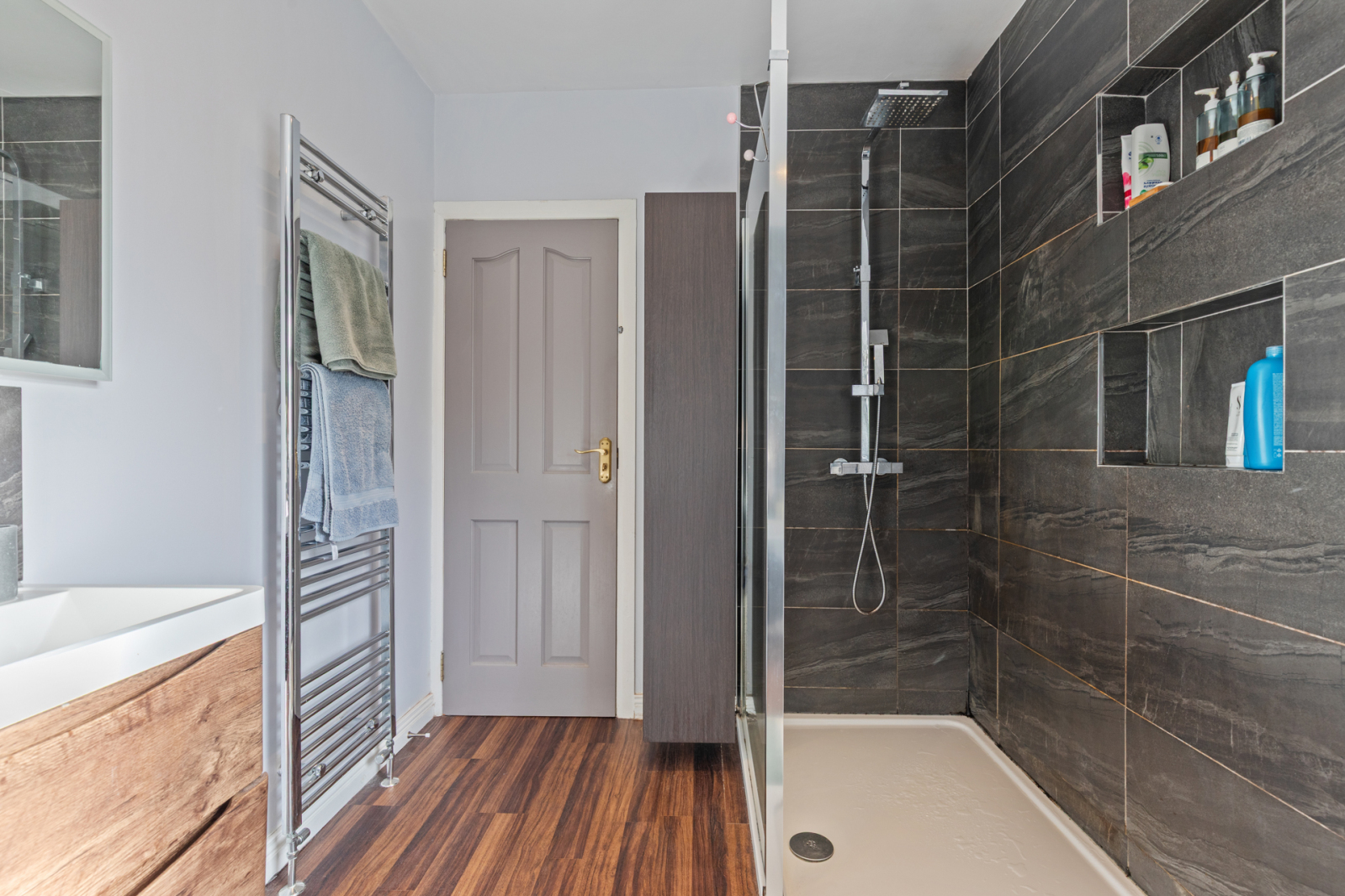 Wood laminate flooring, under stairs storage.