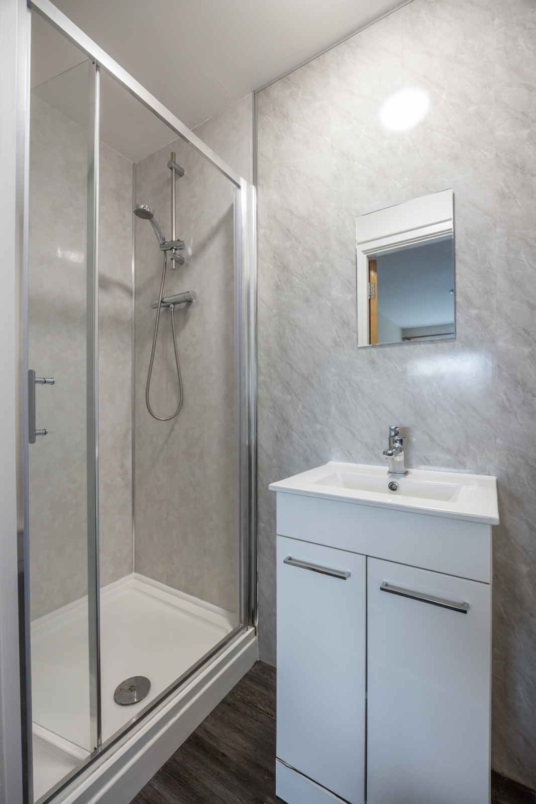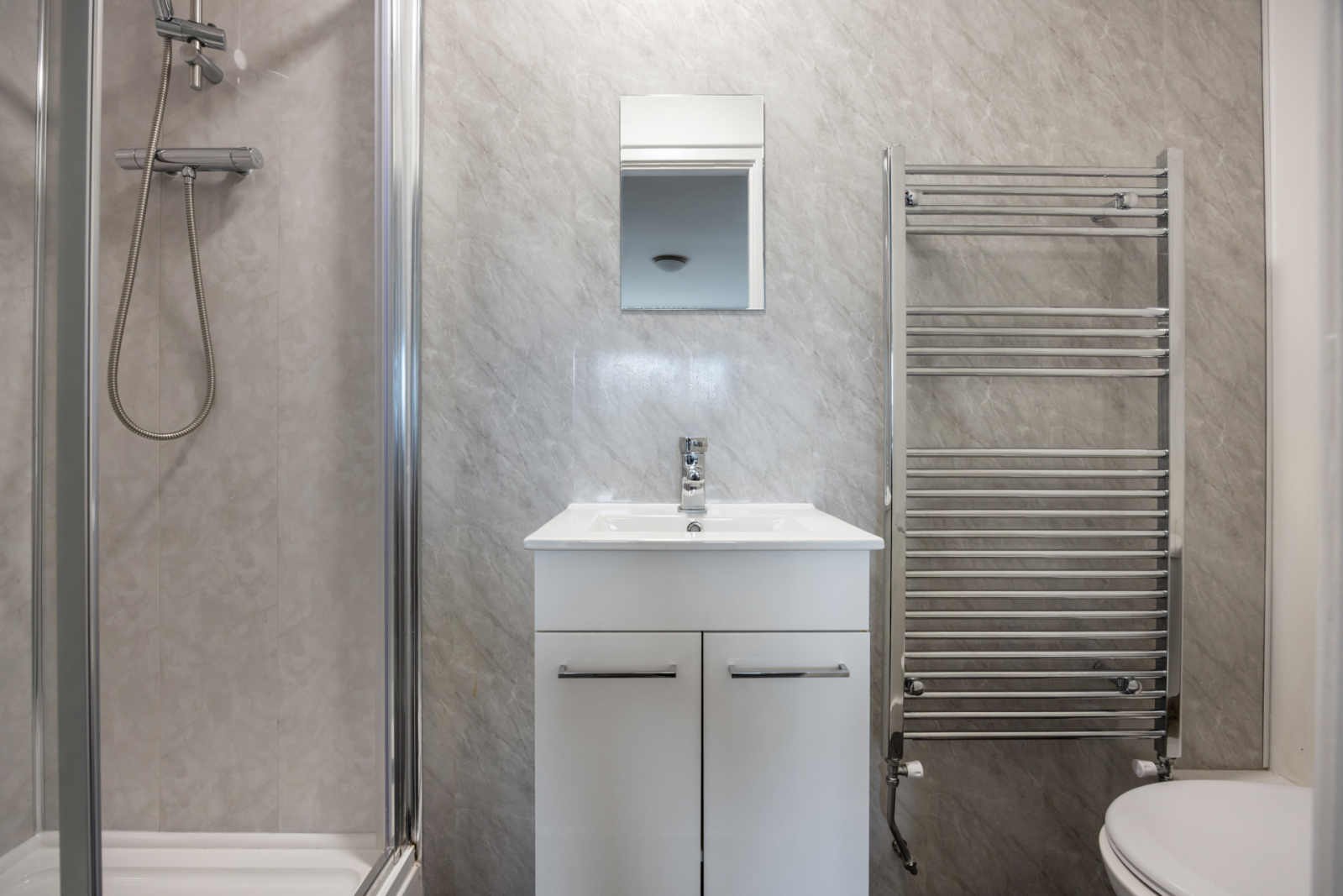 White suite comprising of low flush WC, wash hand basin with mixer and storage below, walk-in thermostatically controlled shower, panelled walls, vinyl flooring, extractor fan, vertical chrome heated towel rail.