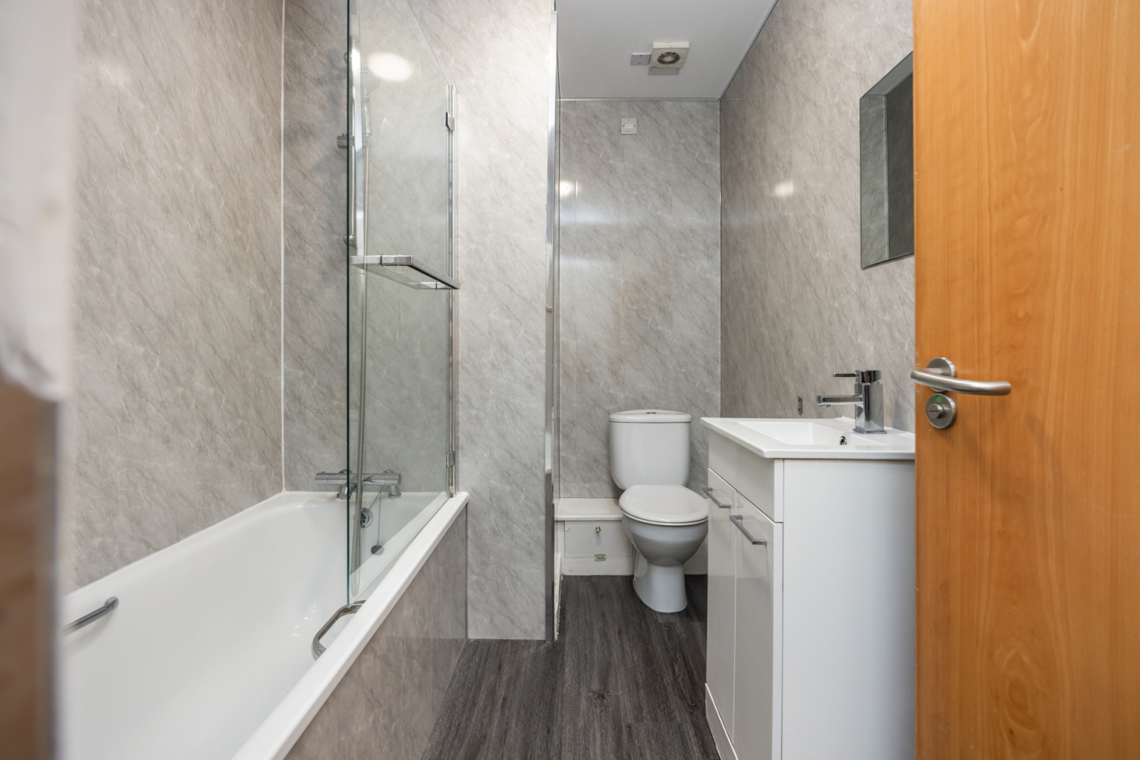 White suite comprising of low flush WC, wash hand basin with mixer tap and storage below, panelled bath with thermostatically controlled shower and mixer tap, panelled walls, vinyl flooring, extractor fan.