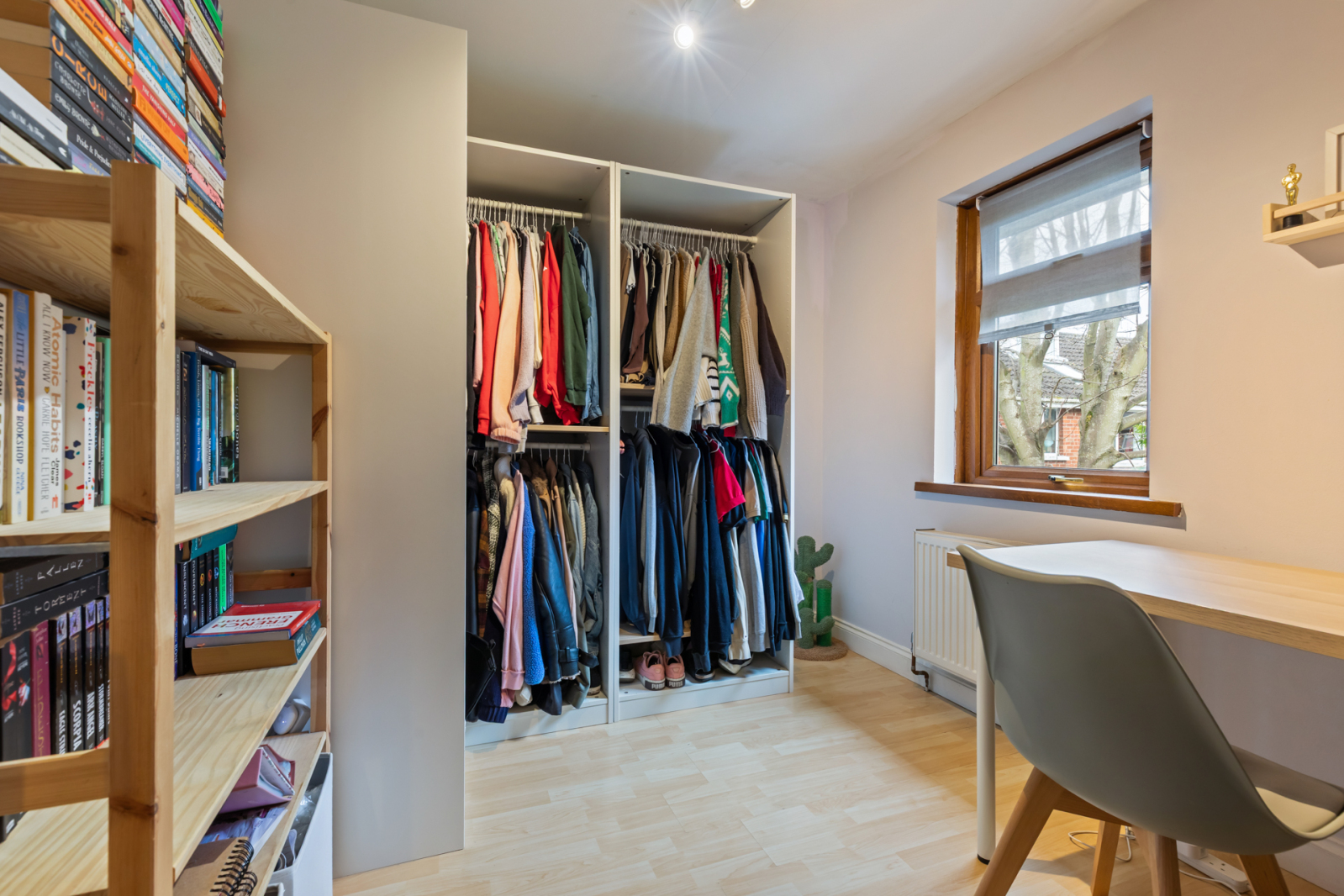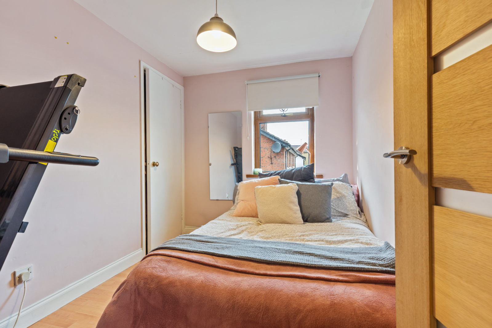 Laminate wooden flooring, built in wardrobe.