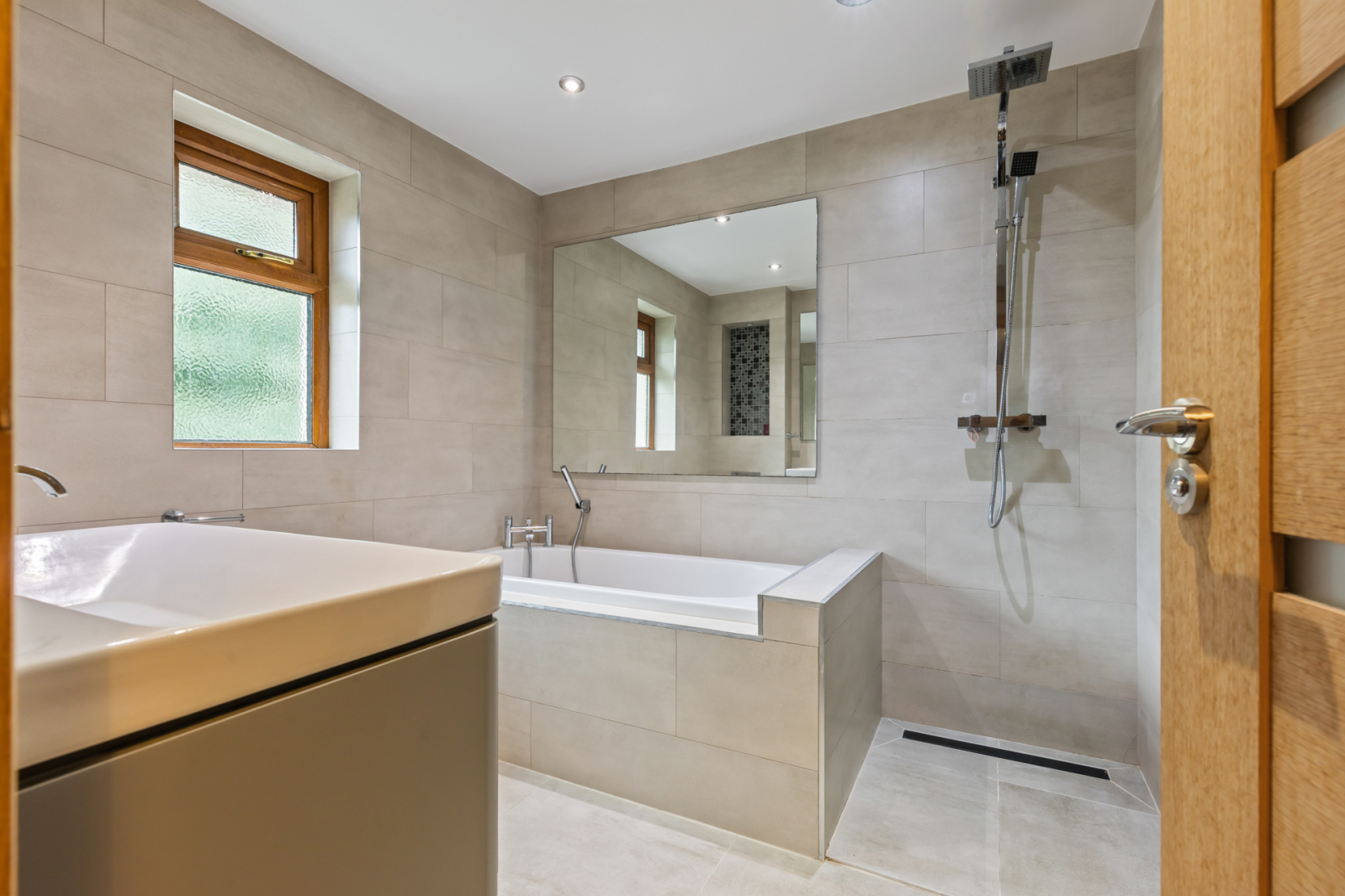 Comprising: Fully tiled bath with chrome dual mixer tap and telephone hand shower. Fully tiled walk in shower and thermostatically controlled shower unit with telephone hand shower and overhead drencher, vanity unit with inset sink and chrome dual mixer tap, dual flush WC, under floor heating, fully tiled walls, ceramic tiled flooring, recessed spotlighting.