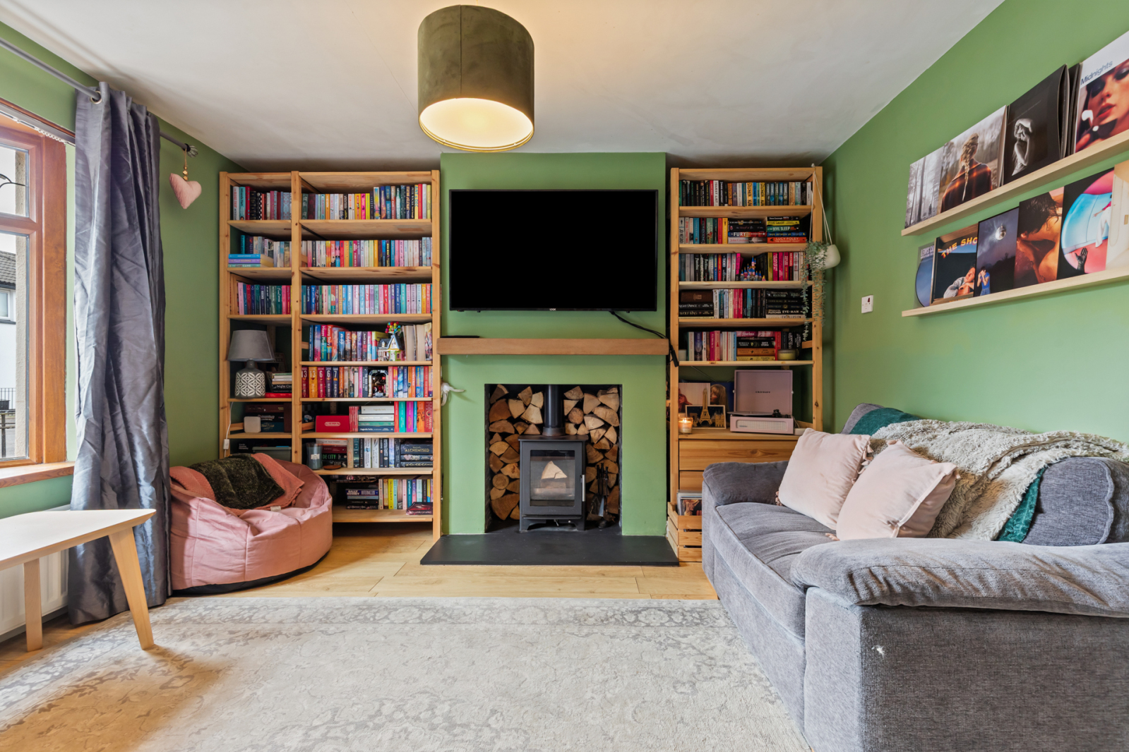Multi fuel wood burning stove with tiled hearth and floating mantle. Laminate wooden flooring. Oriel bay window.