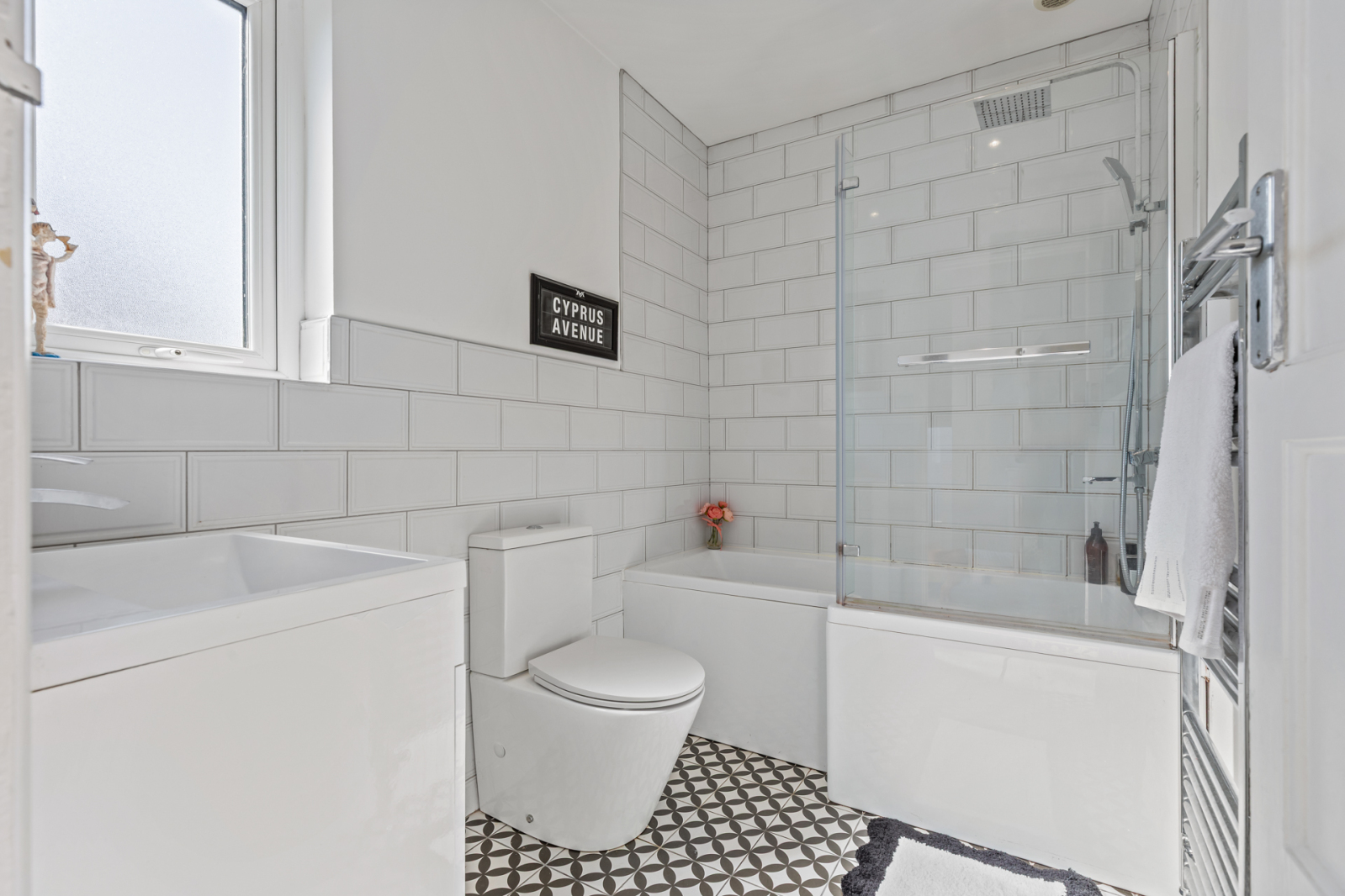 White suite comprising: Shower bath with overhead rain shower, low flush WC, vanity sink unit with mixer taps, chrome towel radiator, partly tiled walls, ceramic tiled floor.
