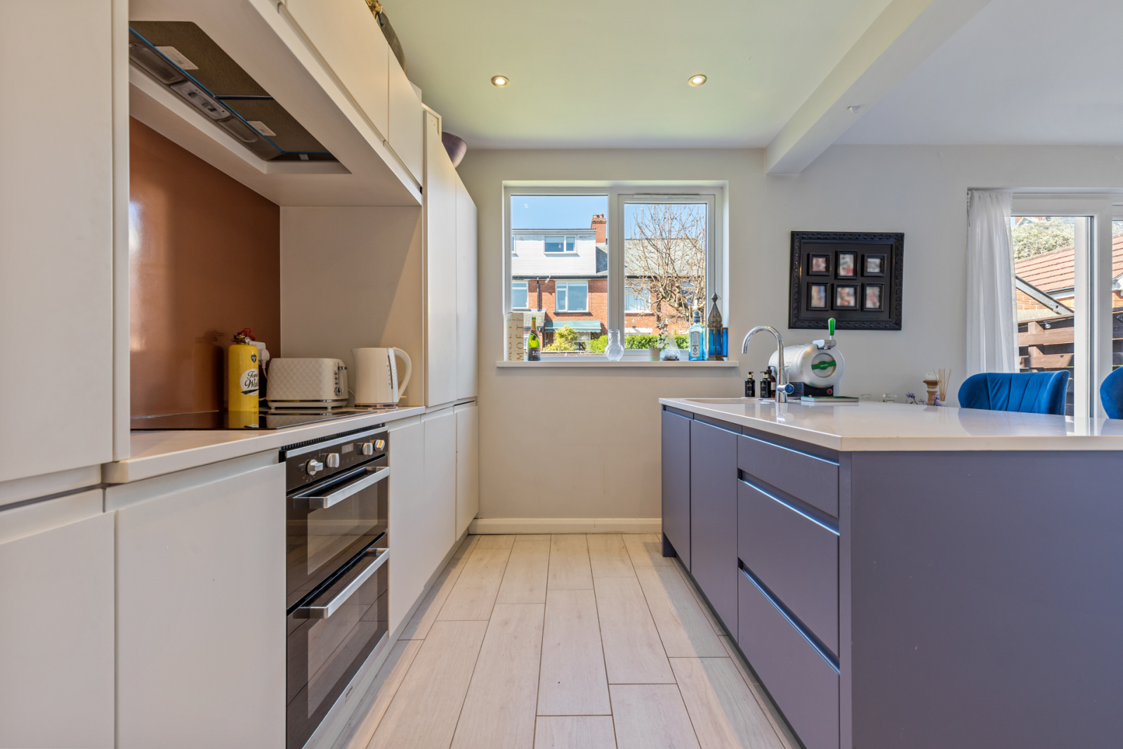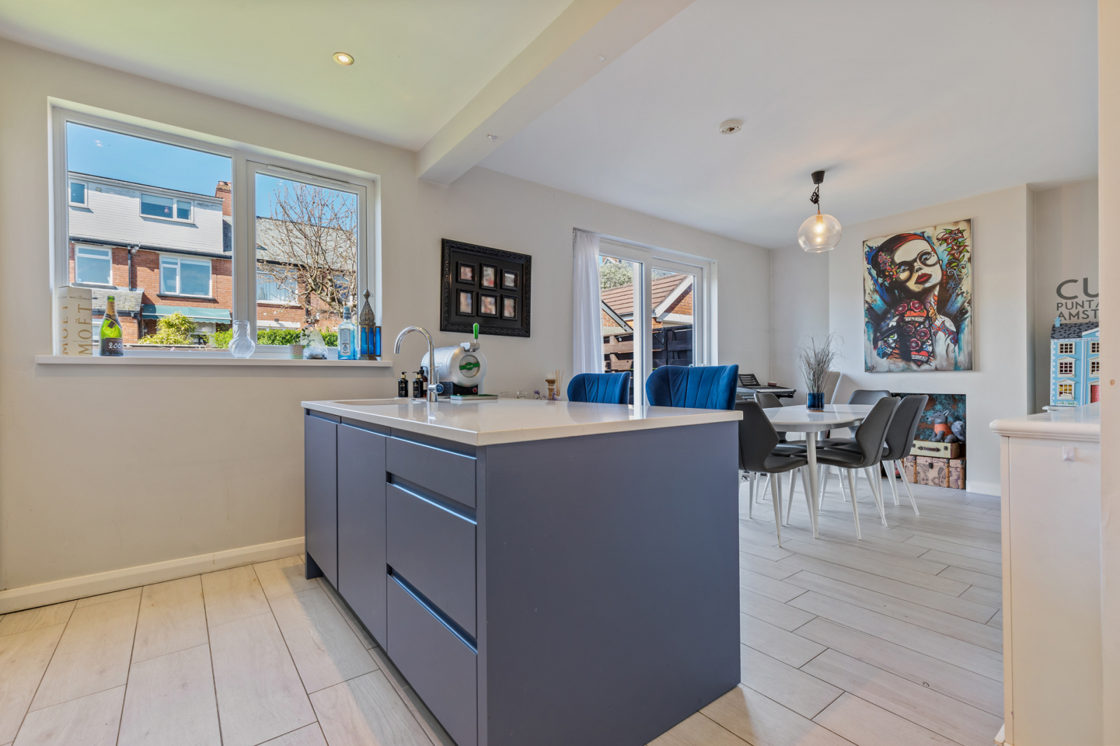 Full range of high and low level units with Quartz work surfaces, 4 ring induction hob, under oven, central island with Quartz work surfaces, stainless steel single drainer sink unit with mixer taps, fridge freezer, dishwasher, ceramic tiled floor, French double sliding doors to rear.