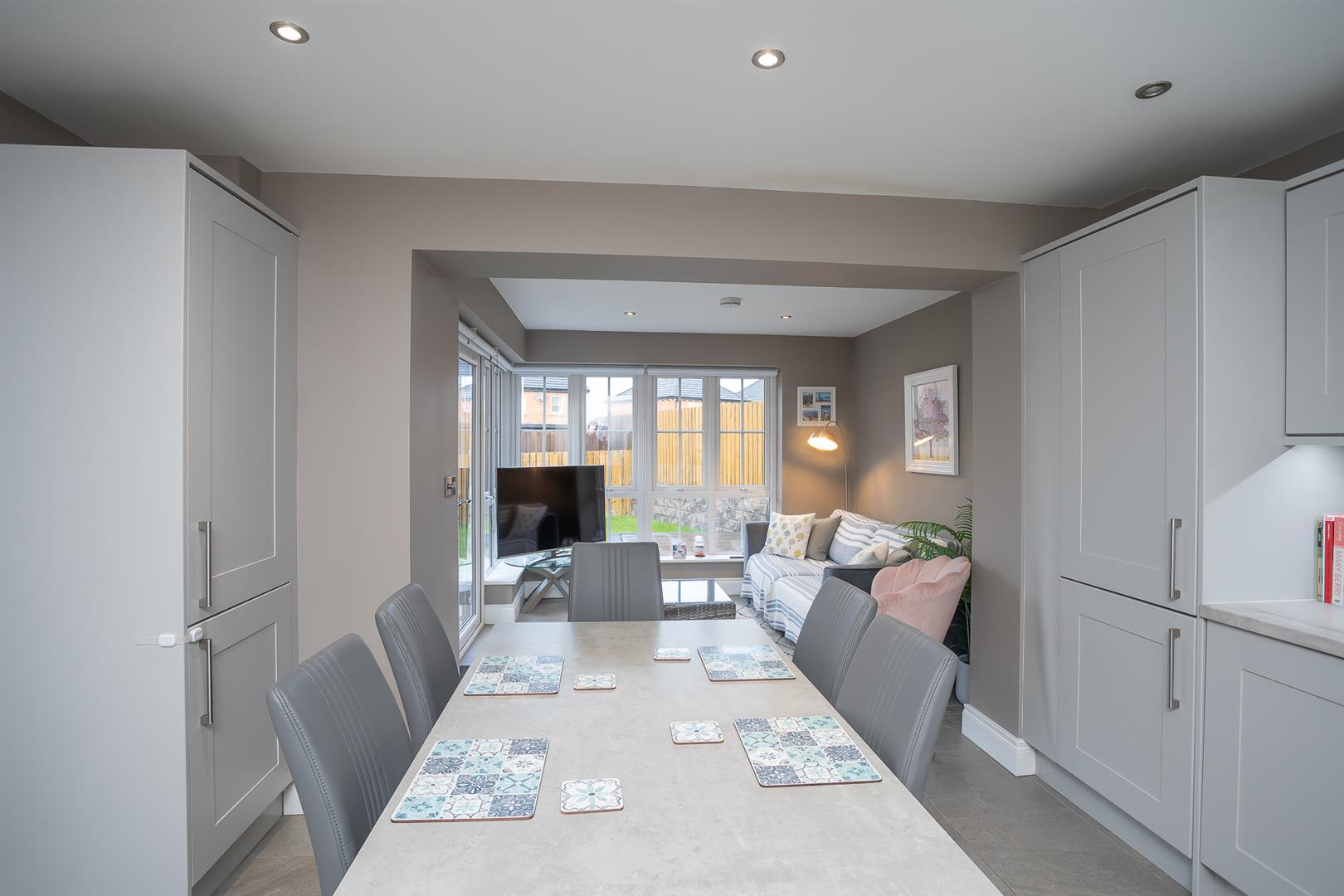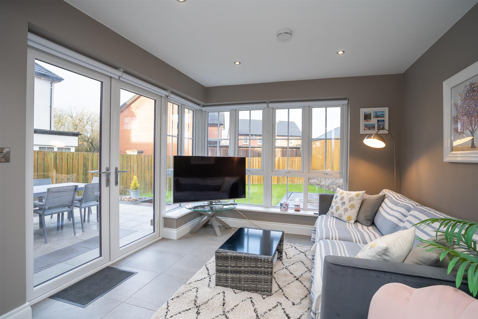A bright sun room with wrap-around windows and French double doors leading directly to the rear garden. Ceramic tiled floor and recessed spotlights.