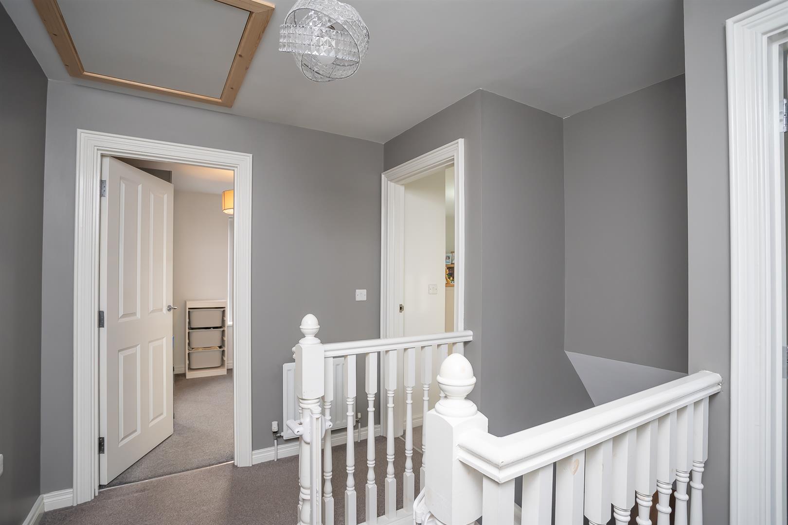 Carpeted stairway with hand-painted wooden banisters leading to carpeted landing with access to floored roofspace.