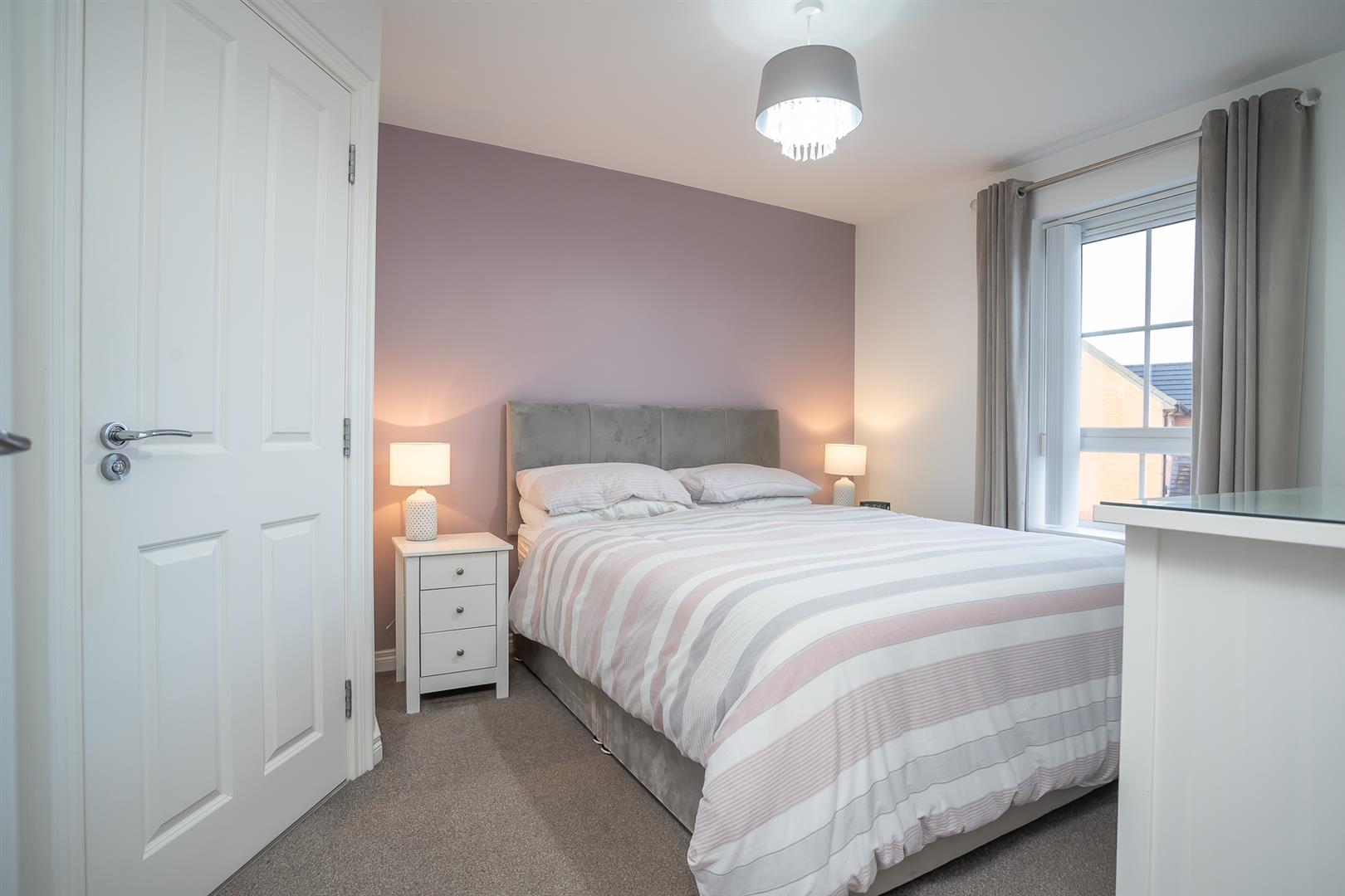 Luxurious master bedroom, tastefully decorated with skirting, and uPVC window overlooking the rear of the property.