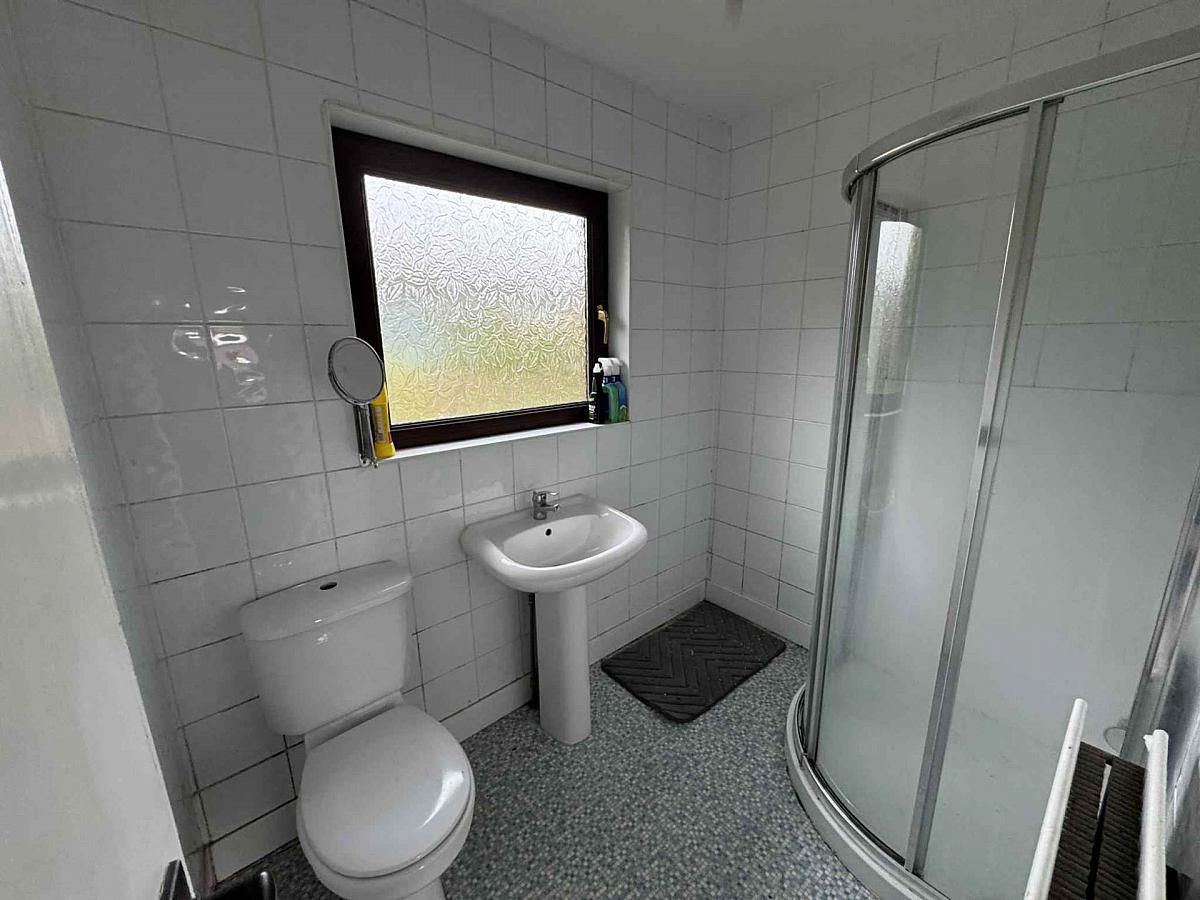 White suite comprising pedestal wash hand basin and low flush WC. Matching tiled shower cubicle with Triton electric shower fitting. Fully tiled walls.