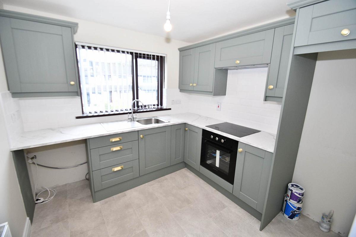 Modern fitted kitchen with a range of high and low level units, formica work surfaces, stainless steel sink drainer, built in oven and ceramic hob, plumbed for washing machine, housing for fridge freezer, vinyl flooring