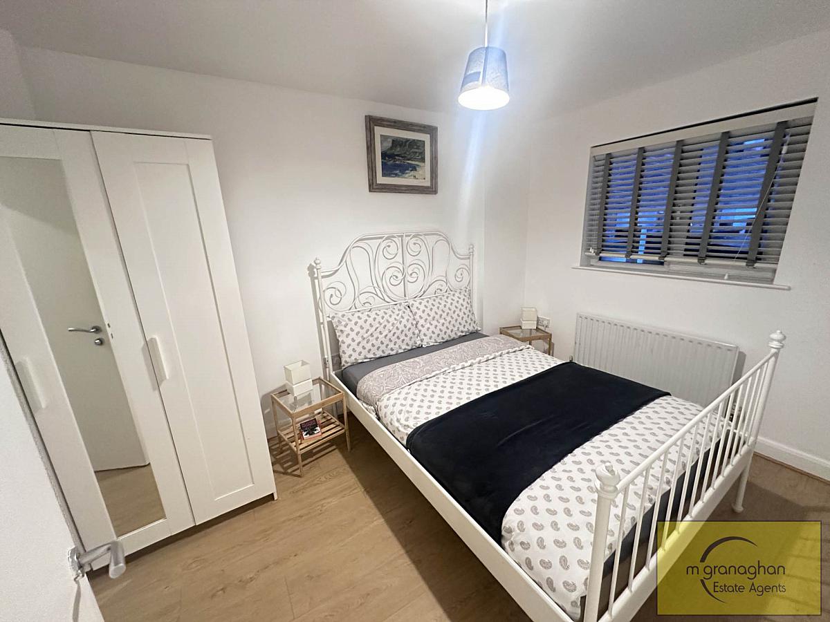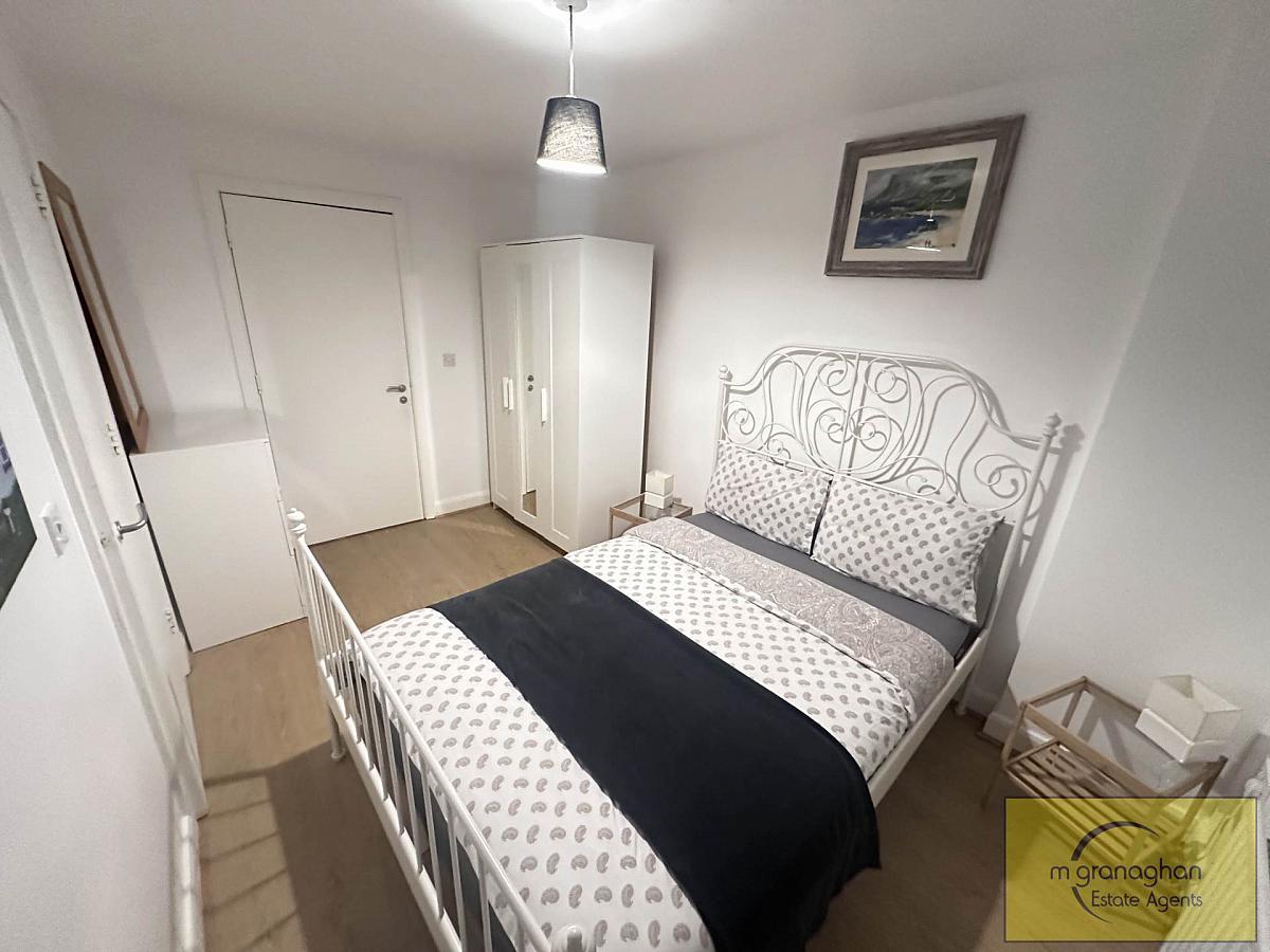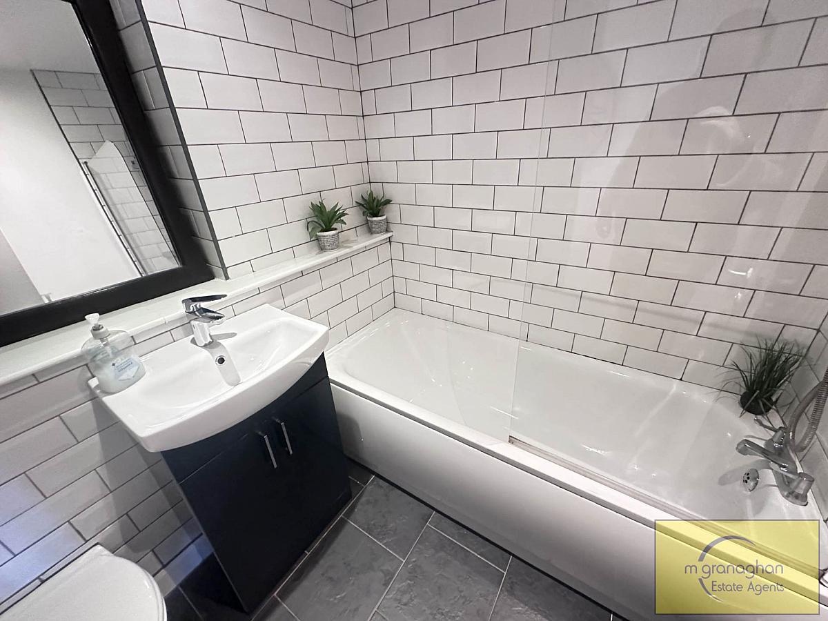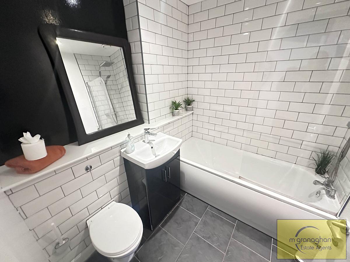 The apartment features two comfortable bedrooms, each offering generous floor space. The bathroom is tastefully finished with modern fixtures, including a bath with overhead shower, a wash basin, and a WC, all presented to a high standard.