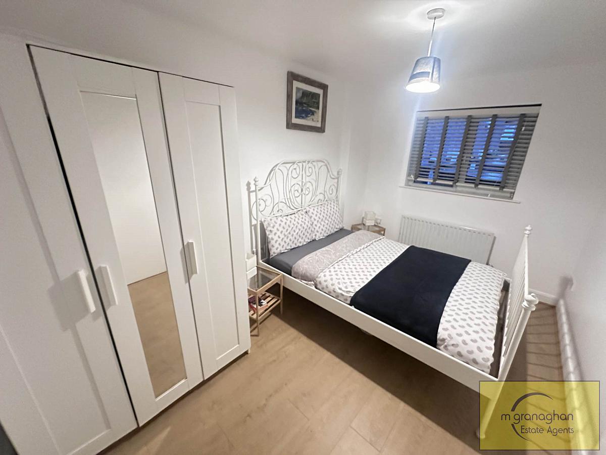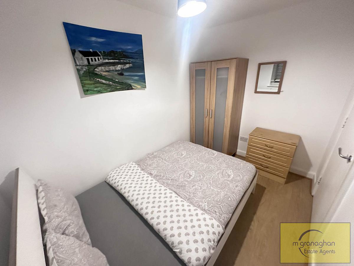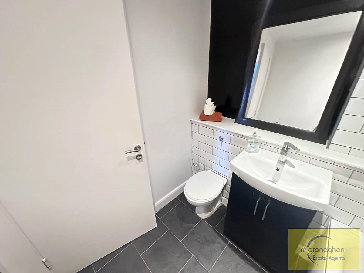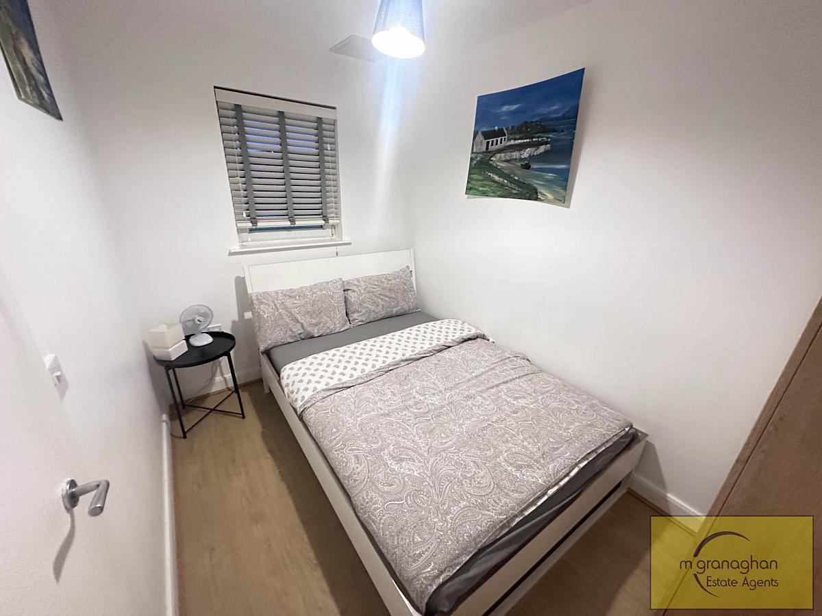 The apartment features two comfortable bedrooms, each offering generous floor space. The bathroom is tastefully finished with modern fixtures, including a bath with overhead shower, a wash basin, and a WC, all presented to a high standard.
