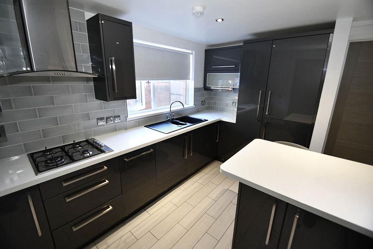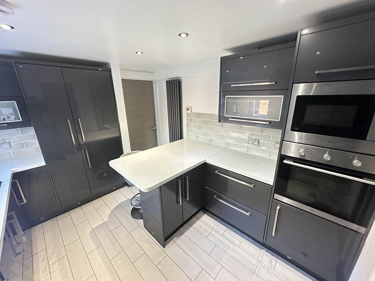 Modern fully fitted kitchen comprising of built in fridge freezer, integrated hob, stainless steel extractor fan, breakfast bar, dishwasher, ceramic tile floor, part tile walls