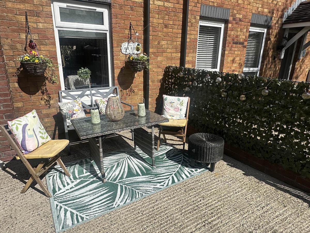 Enclosed rear with tiled patio area, garden in lawn and mature hedging