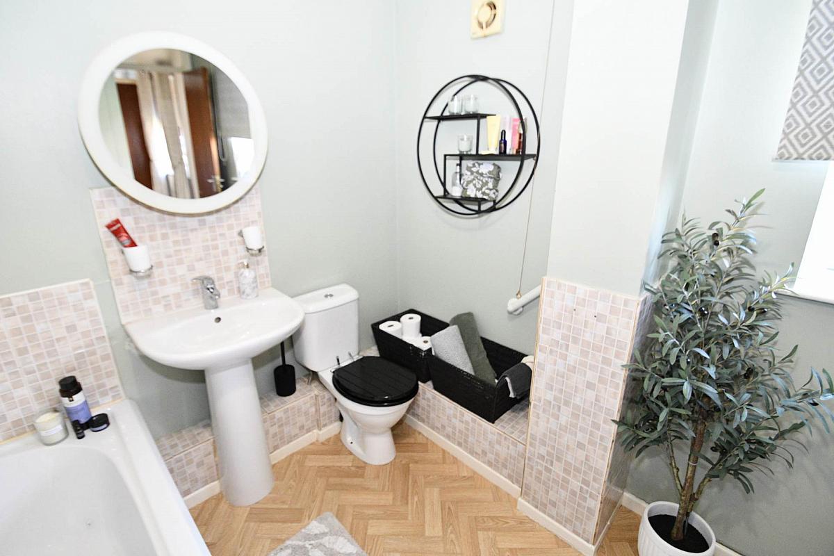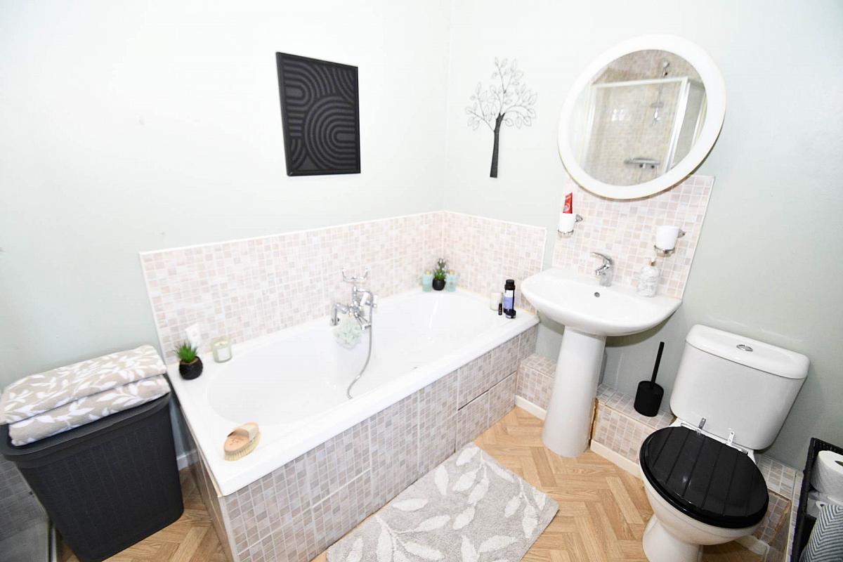 The ground floor also benefits from a fitted kitchen with a dining area, ideal for everyday meals and entertaining, alongside a convenient downstairs WC. Upstairs, you will find two well-proportioned bedrooms, both offering ample space and natural light. The white family bathroom suite is thoughtfully designed with both bath and shower facilities to suit all needs.