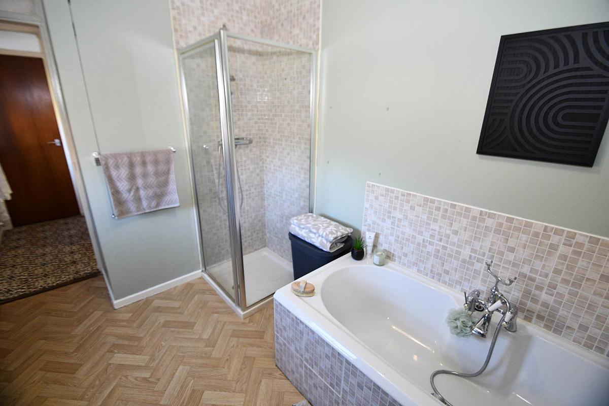 White suite comprising of bath, shower cubicle, low flush WC, pedestal wash hand basin, part tiled walls and vinyl flooring