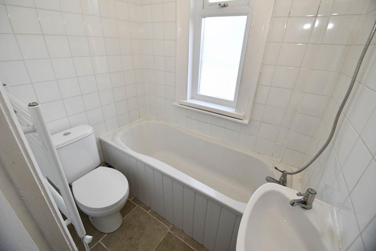 White suite comprising of panel bath, low flush WC, wash hand basin, part tiled walls, ceramic tiled flooring