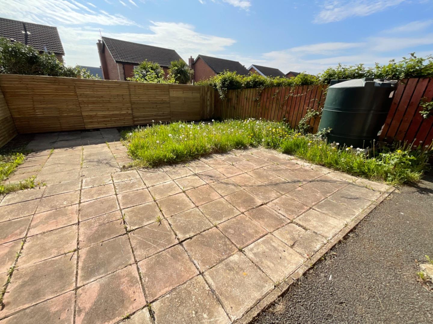 Enclosed rear garden laid out in lawn with patio area and panelled fencing