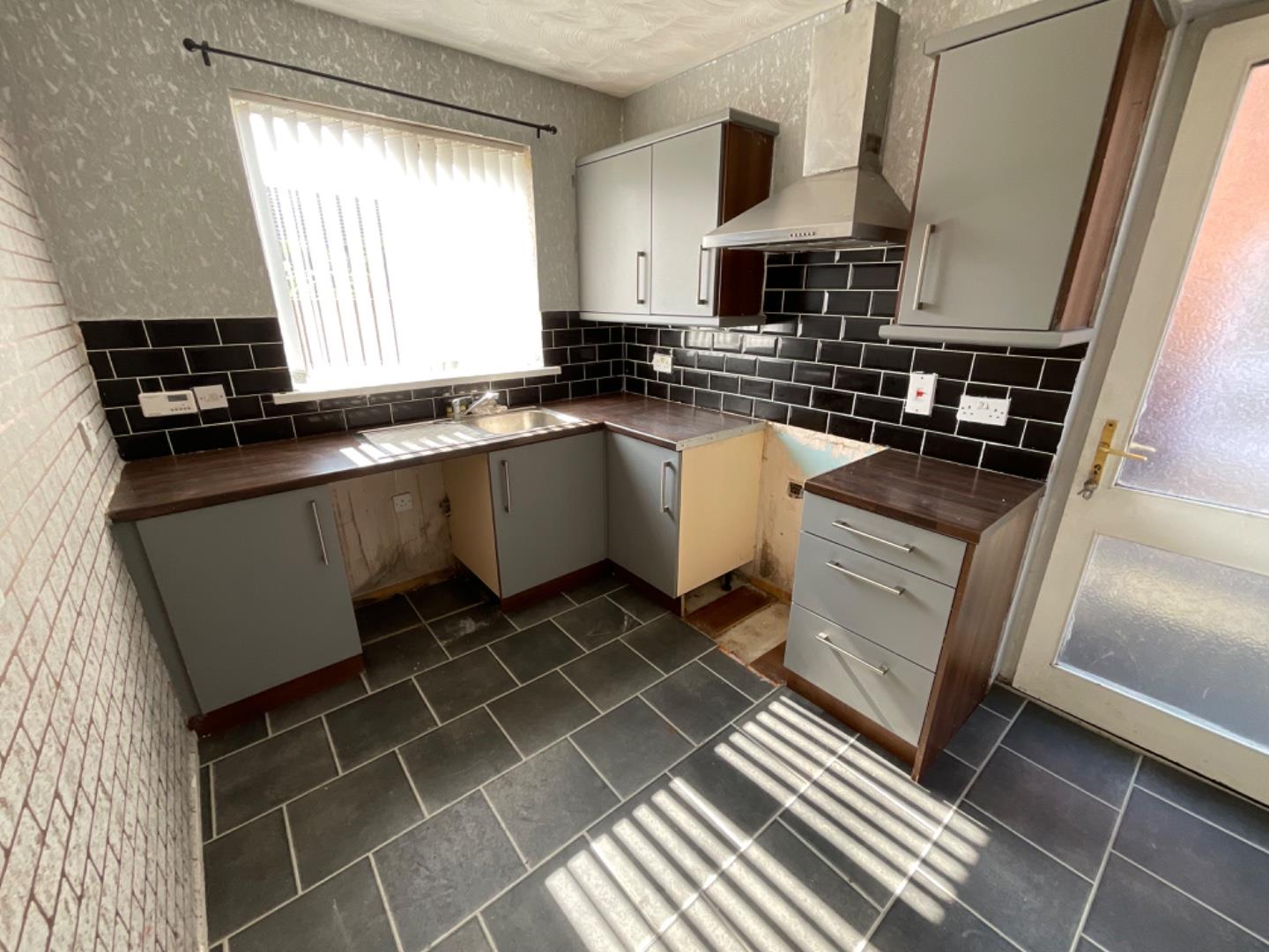 Modern fitted kitchen with both high and low level units, tiled splash backs and contrasting worktops, stainless steel sink and drainer with mixer tap, cooker space with extractor hood, plumbed for a washing machine, tile effect laminate flooring, access to driveway and rear yard