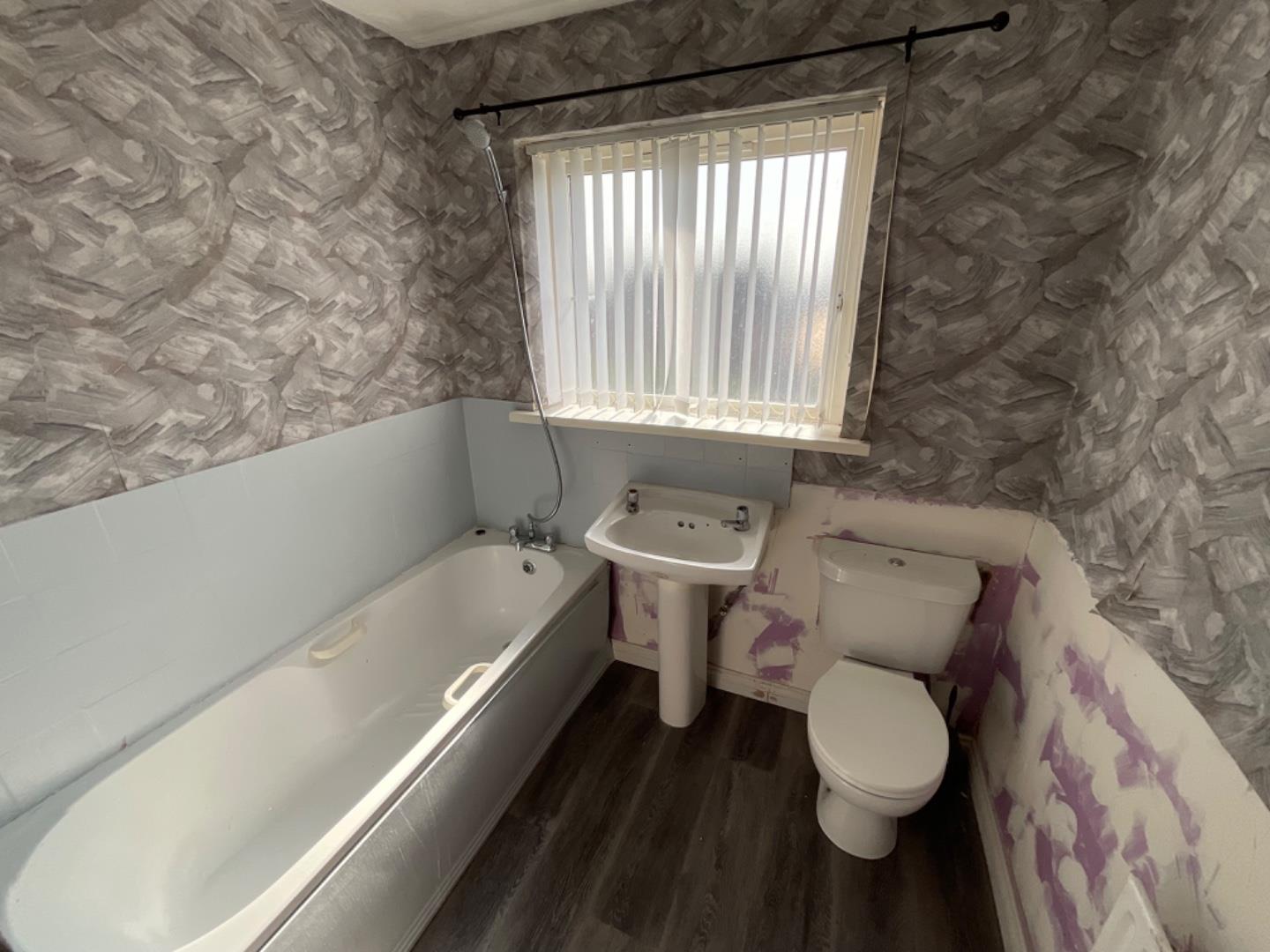Classic white bathroom suite including low flush WC, pedestal wash hand basin and panelled bath, vinyl flooring, panelled radiator