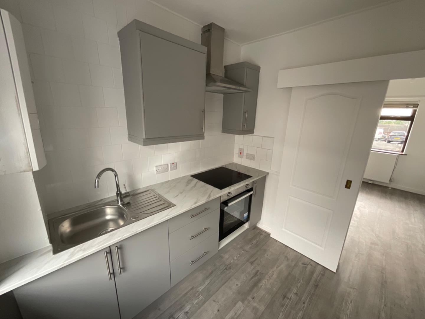Brand new fitted kitchen with both high and low level units, tiled splash backs and contrasting worktops, stainless steel sink and drainer with mixer taps, integrated oven and hob with extractor hood, wood laminate flooring, wall mounted gas boiler, double panelled radiator