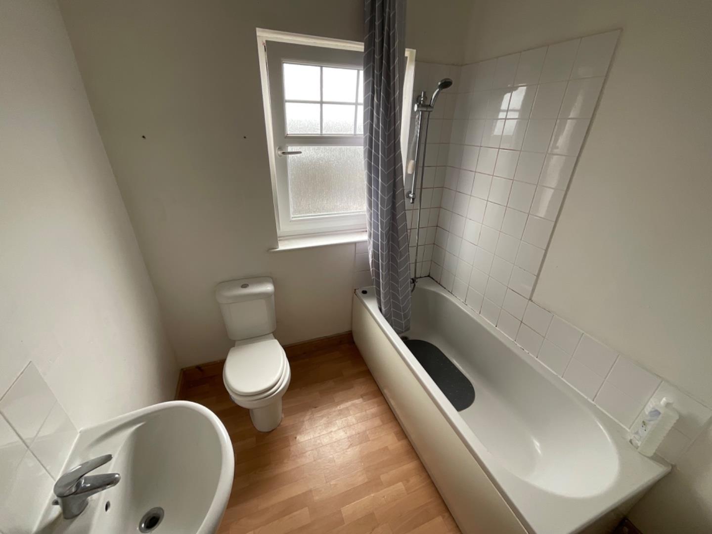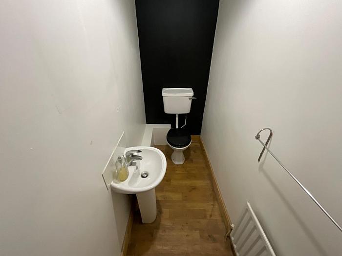 Low flush WC, pedestal wash hand basin, vinyl flooring, panelled radiator
