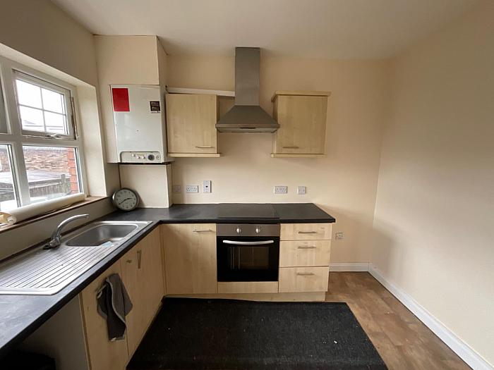 A wide range of high and low level units and contrasting worktops, stainless steel sink and drainer with mixer taps, plumbed for a washing machine, fridge freezer space, double panelled radiator, vinyl flooring, ample dining space, wall mounted gas boiler, access to rear yard
