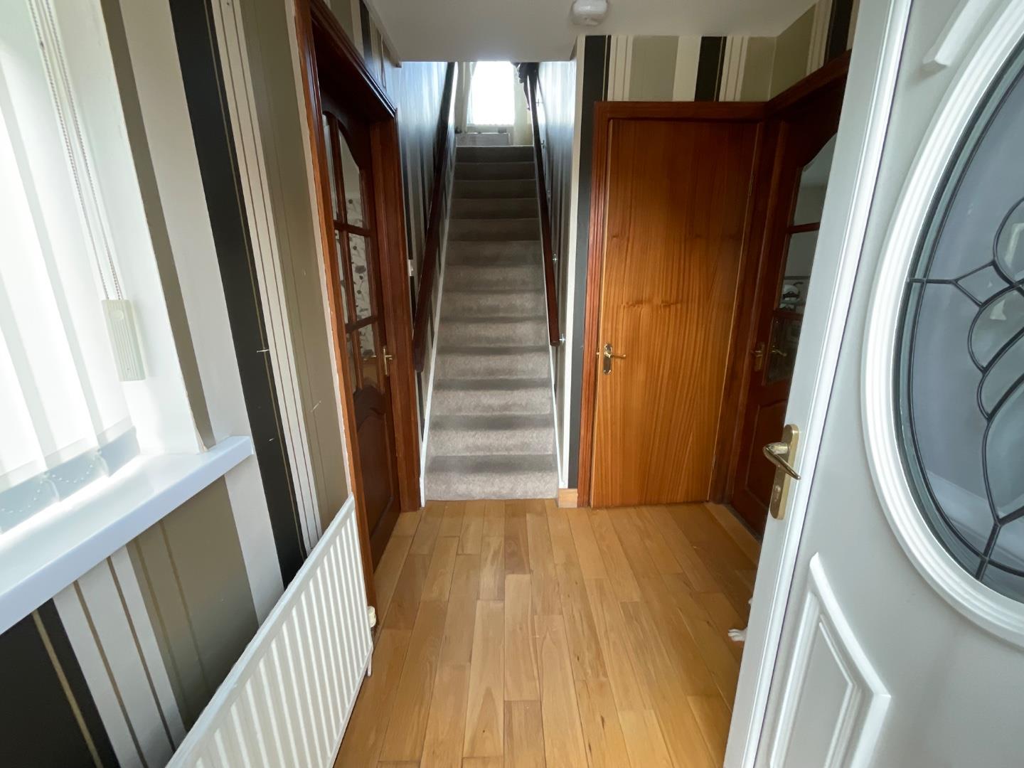 PVC front door with glass inset, enclosed electricity meter, wood laminate flooring, panelled radiator, stairs to first floor
