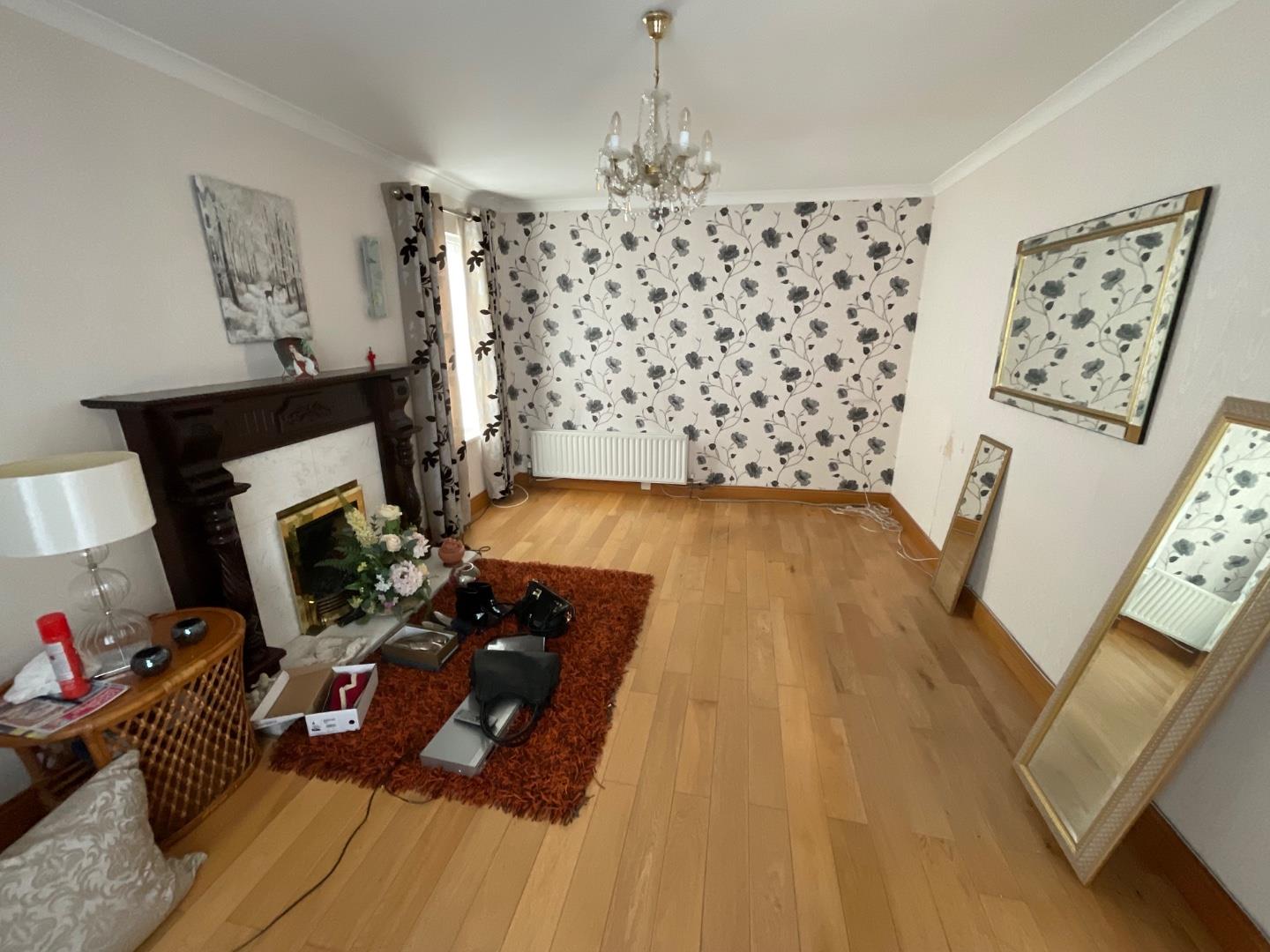Tiled fireplace and surround with electric fire inset, wood laminate flooring, 2 double panelled radiators