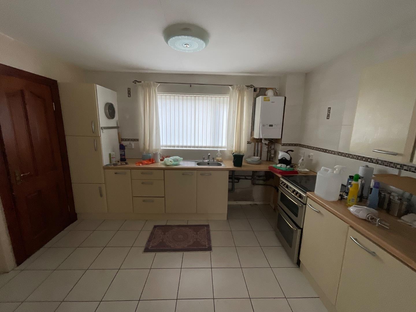 Fitted kitchen with both high and low level units, tiled splash backs and contrasting worktops, stainless steel sink and drainer with mixer taps, plumbed for a washing machine, wall mounted gas boiler, tiled flooring, double panelled radiator, dining space, leading to: