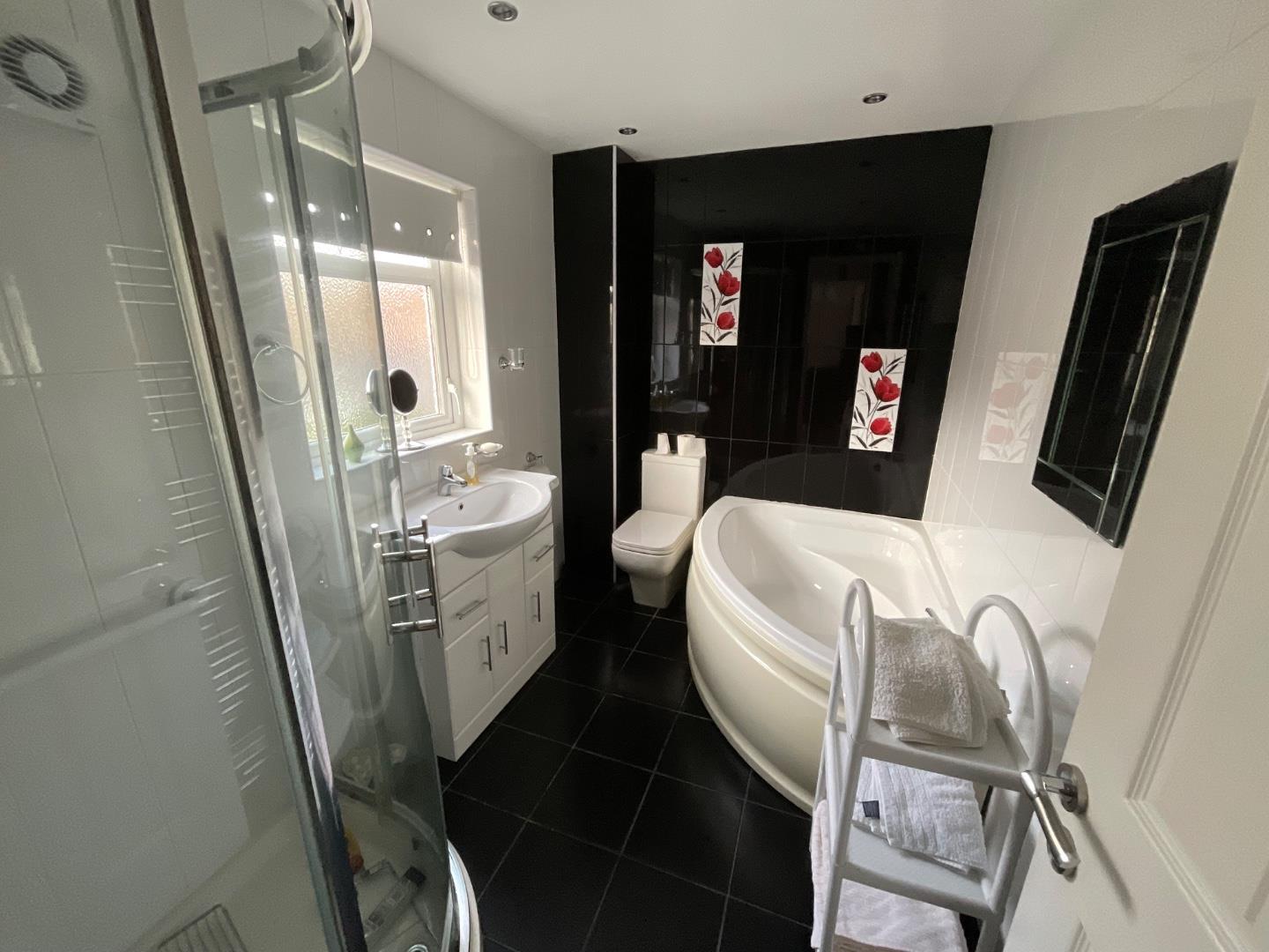 Classic white bathroom suite including low flush WC, wall mounted wash hand basin, panelled bath and free standing shower, tiled flooring and walls, recessed lighting, heated towel rail