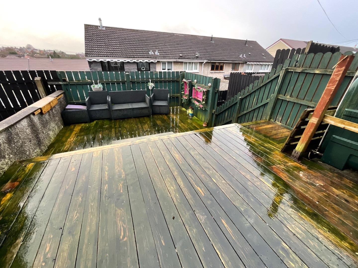 Fully decked with panelled fencing and access to rear entry, enclosed oil boiler