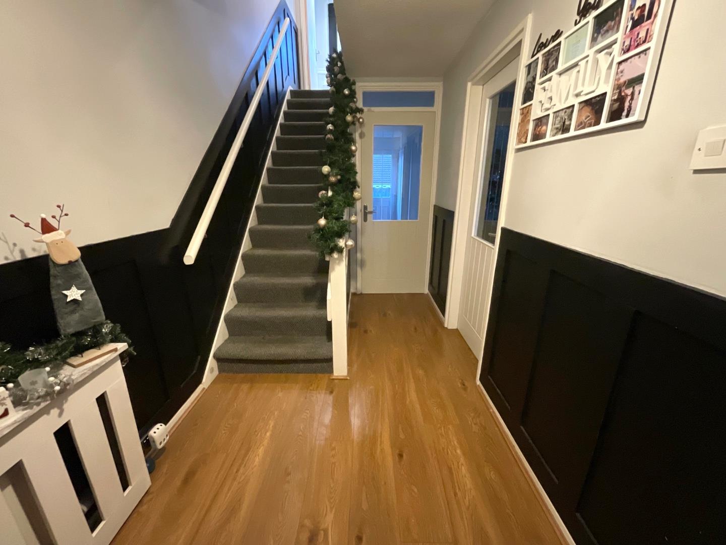 White PVC front door with smoked glass inset, wood laminate flooring, panelled radiator, stairs leading to first floor