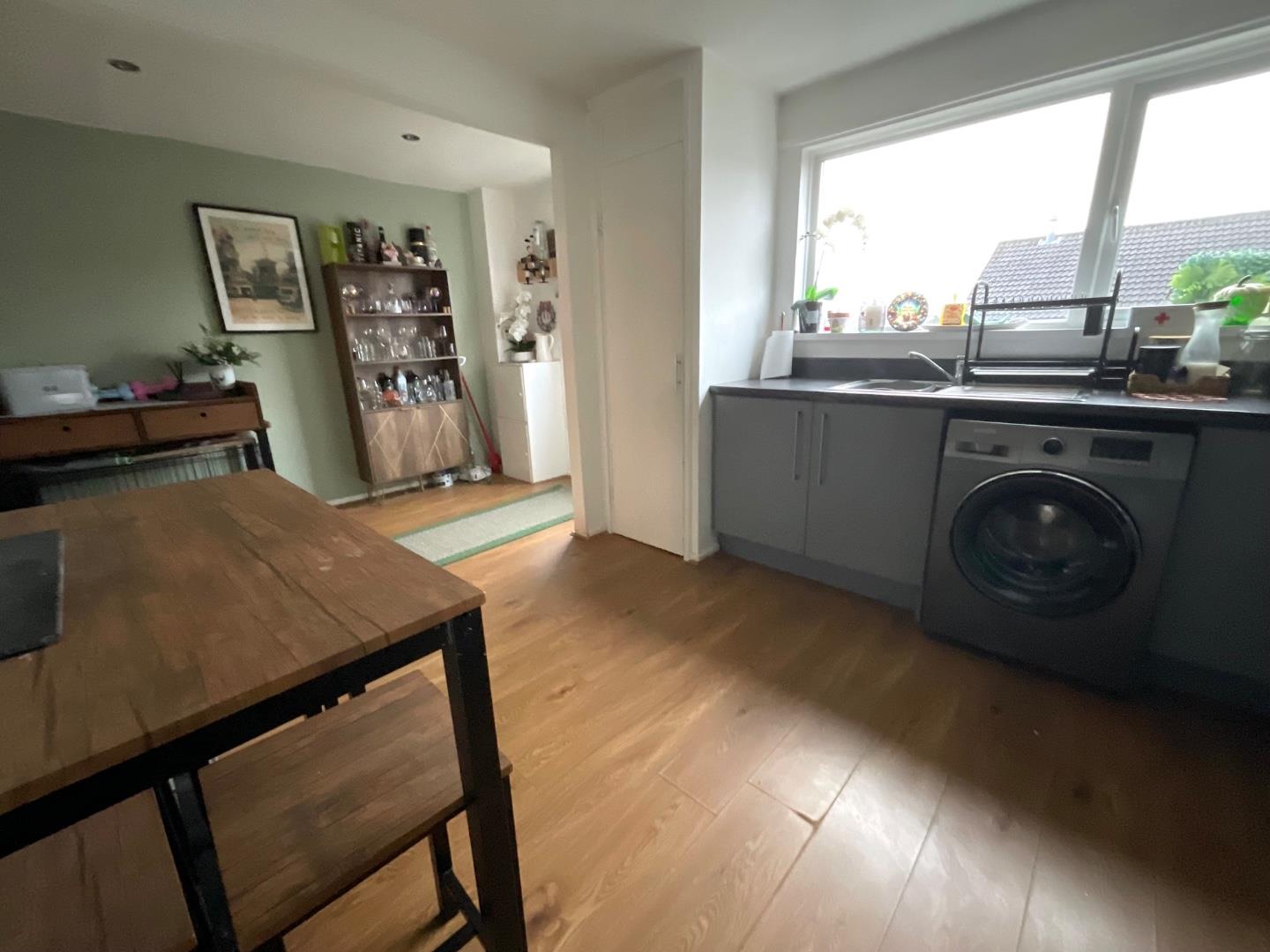 Modern fitted kitchen with both high and low level units and contrasting worktops, stainless steel sink and drainer with mixer taps, integrated oven and hob with extractor hood, fridge freezer space, plumbed for a washing machine, recessed lighting, wood laminate flooring, double panelled radiator enclosed storage cupboard, enclosed electricity meter, access to rear garden, ample dining space