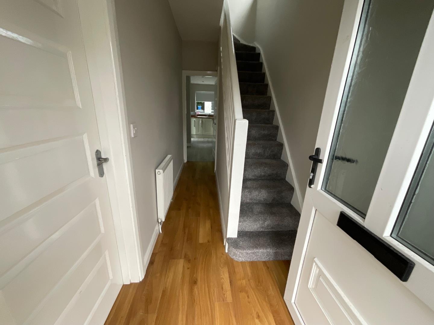 PVC front door with smoked glass insets, under stair storage housing gas boiler, double panelled radiator, wood laminate flooring, stairs leading to first floor