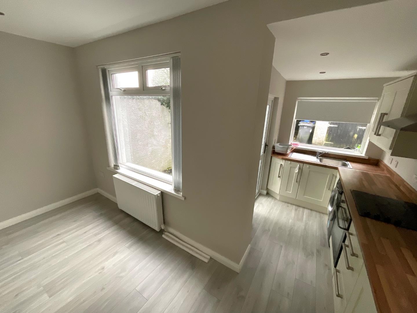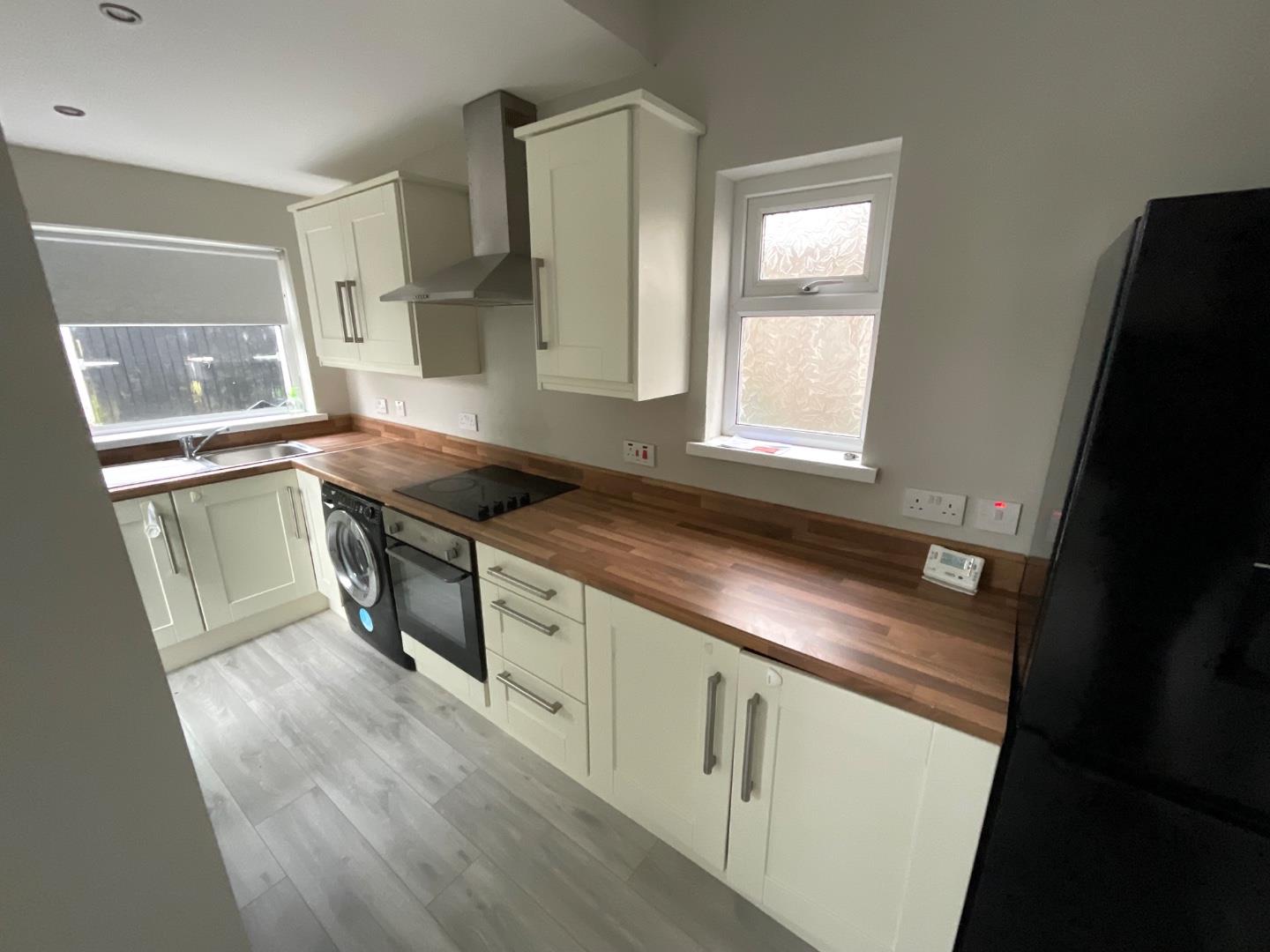 Modern fitted kitchen with both high and low level units and contrasting worktops, integrated oven and hob with extractor hood, stainless steel sink and drainer with mixer tap, fridge freezer space, plumbed for a washing machine, tile effect laminate flooring, recessed lighting, double panelled radiator, dining area, access to rear garden
